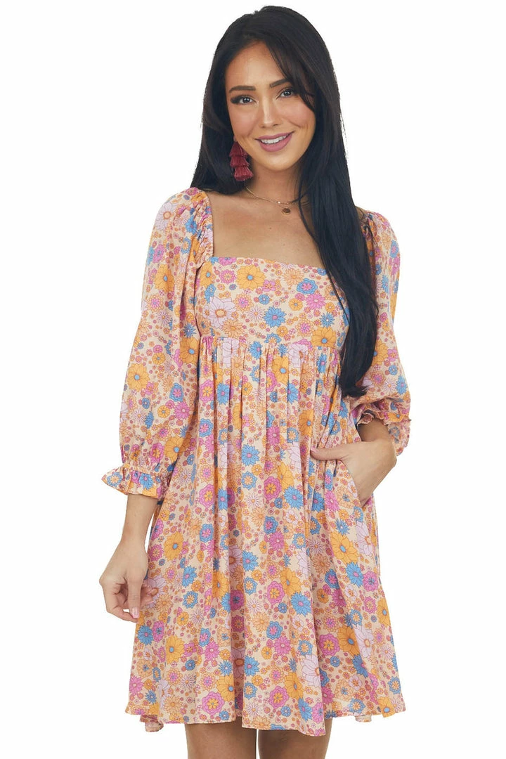 - Peach Floral Babydoll 3/4 Sleeve Short Dress