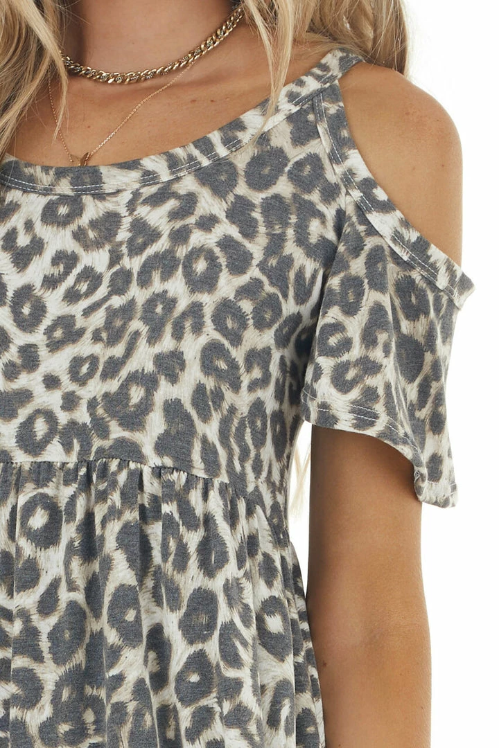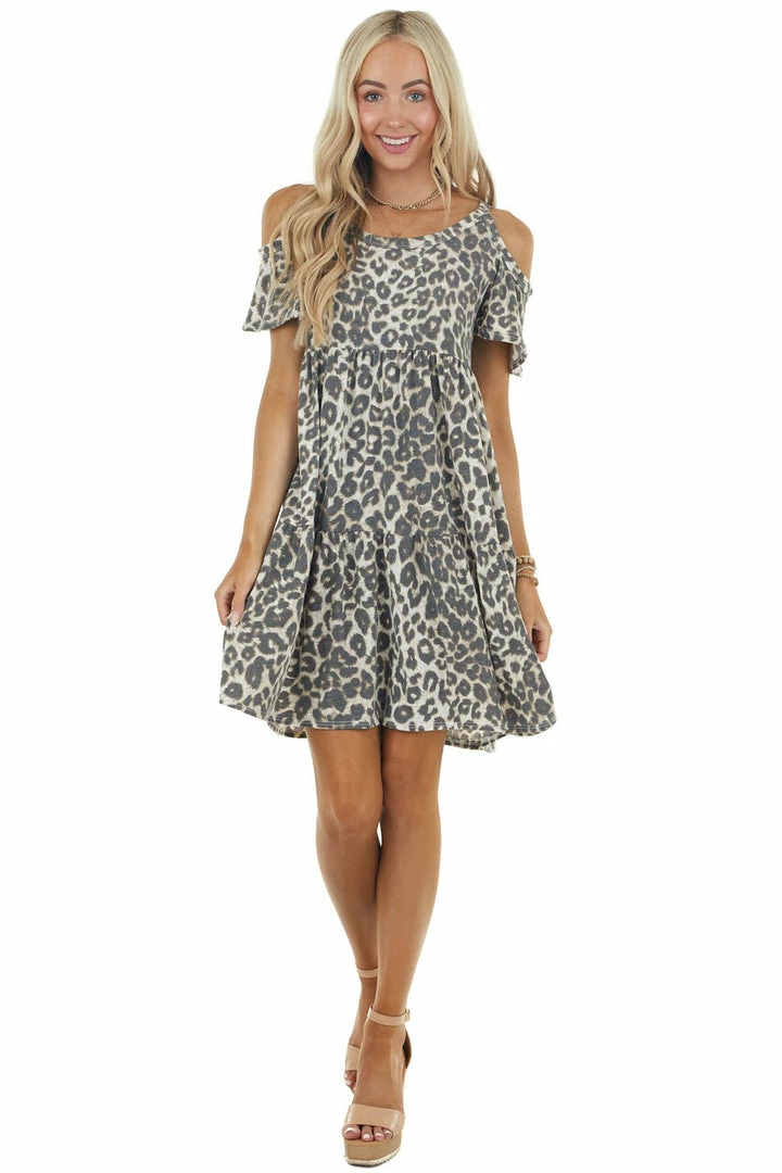 - Latte Leopard Print Cold Shoulder Short Sleeve Short Dress
