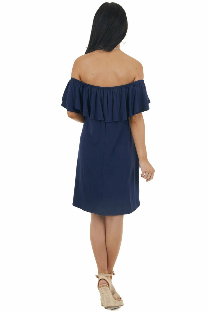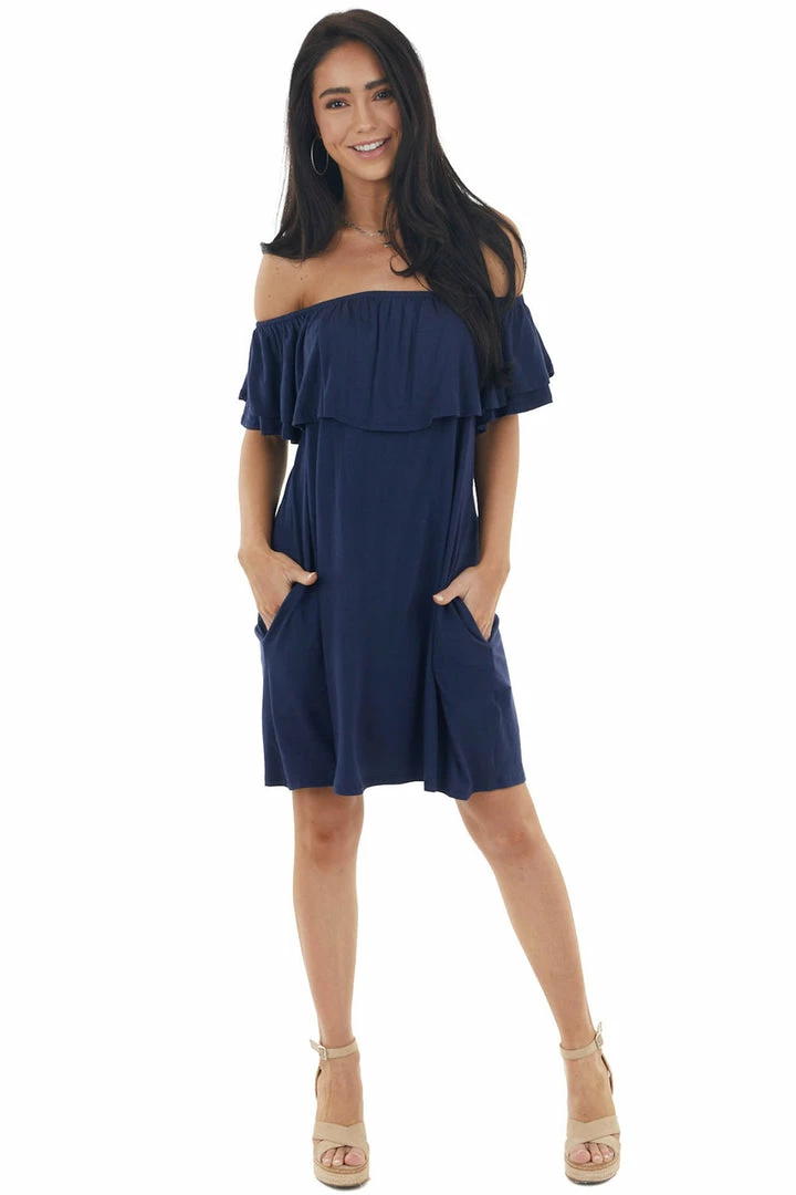 - Navy Off the Shoulder Mini Dress with Ruffle Overlay