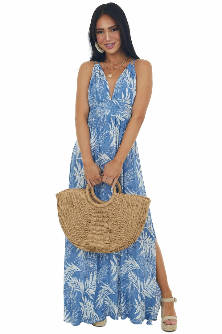 - Dusty Blue Leaf Print Open Tie Back Maxi Dress