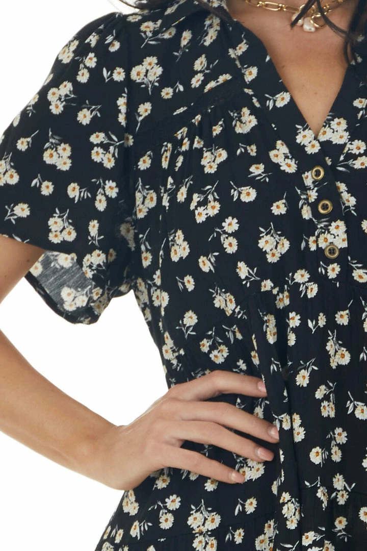 - Black Ditsy Floral Tiered Babydoll Short Dress with Collar