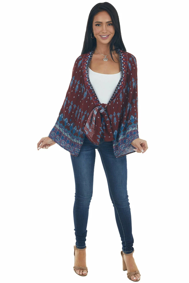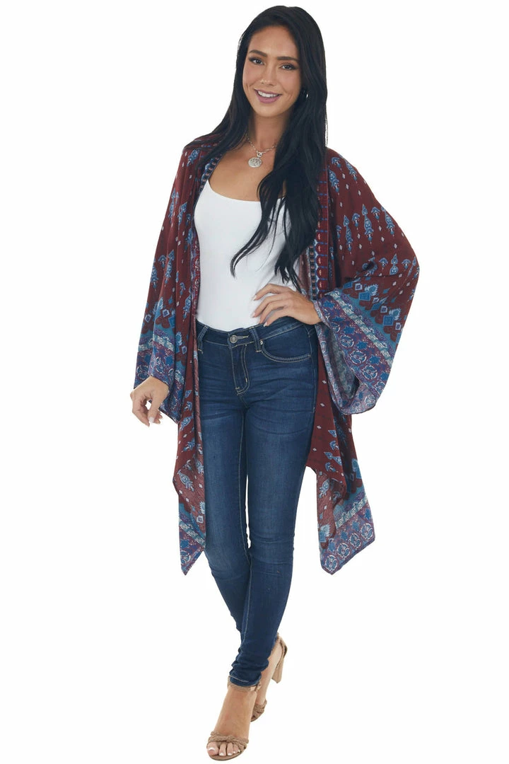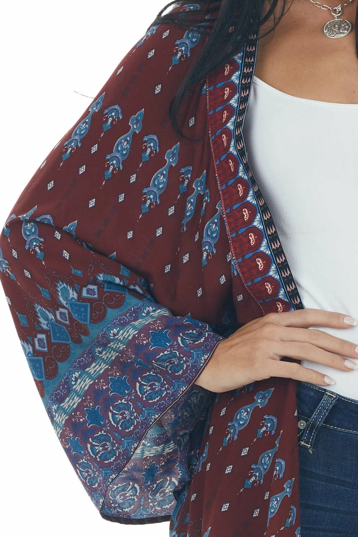 - Burgundy Abstract Print Open Front Kimono