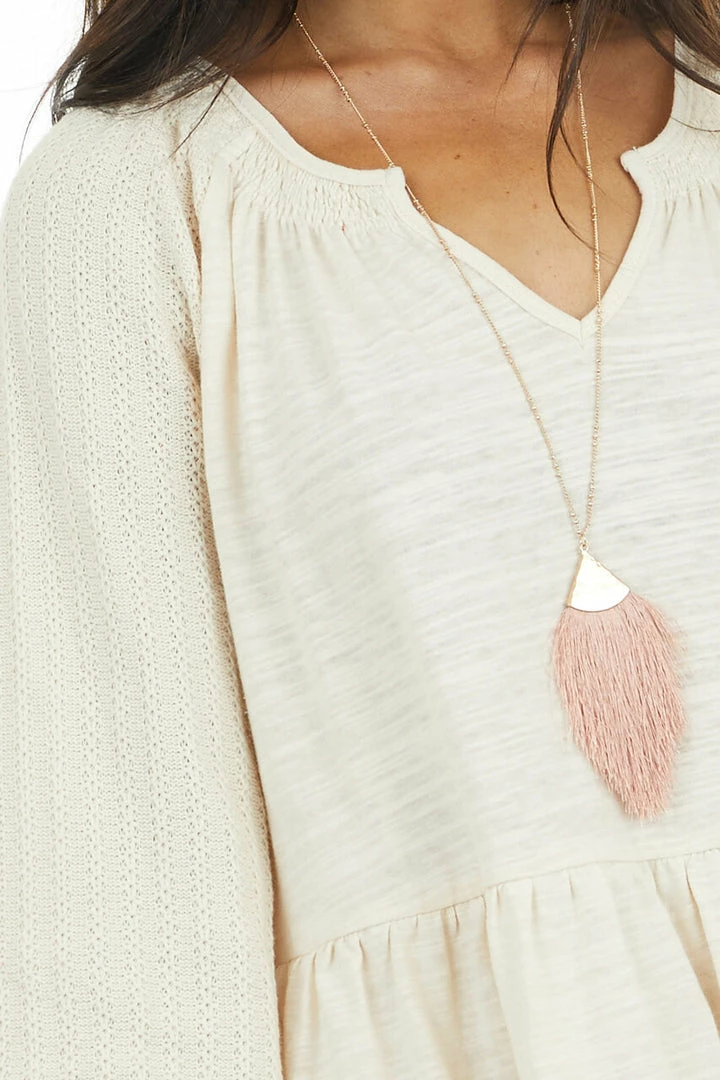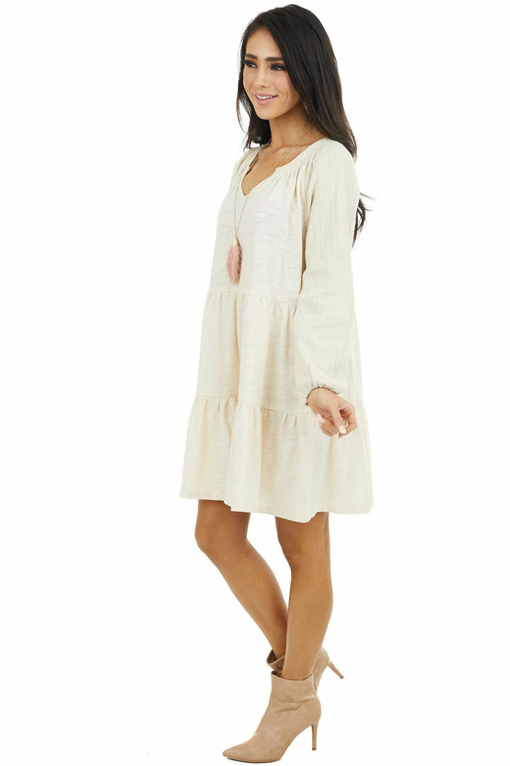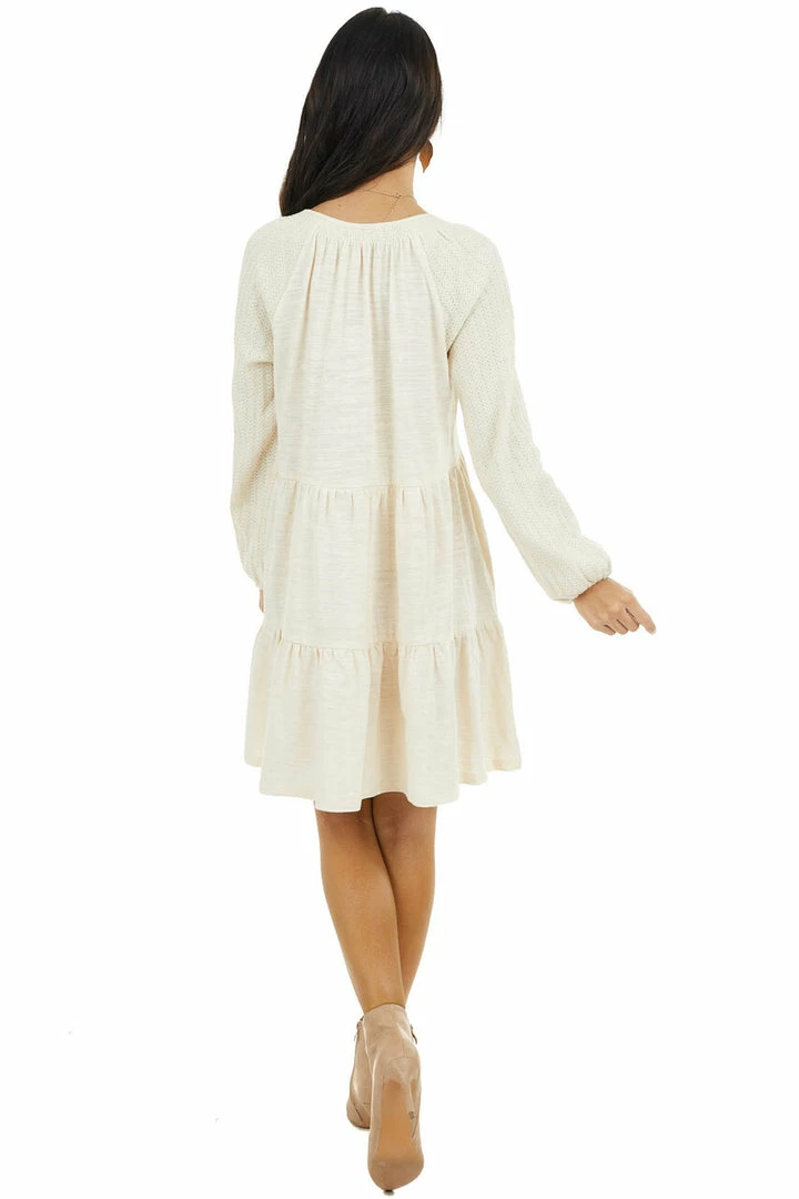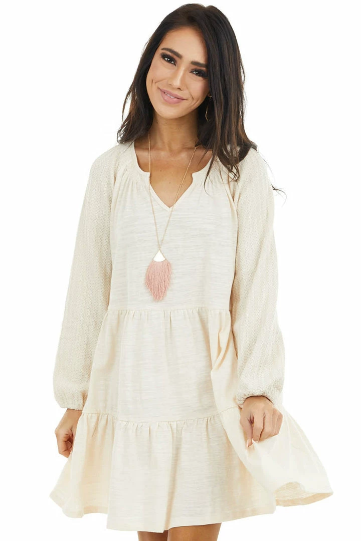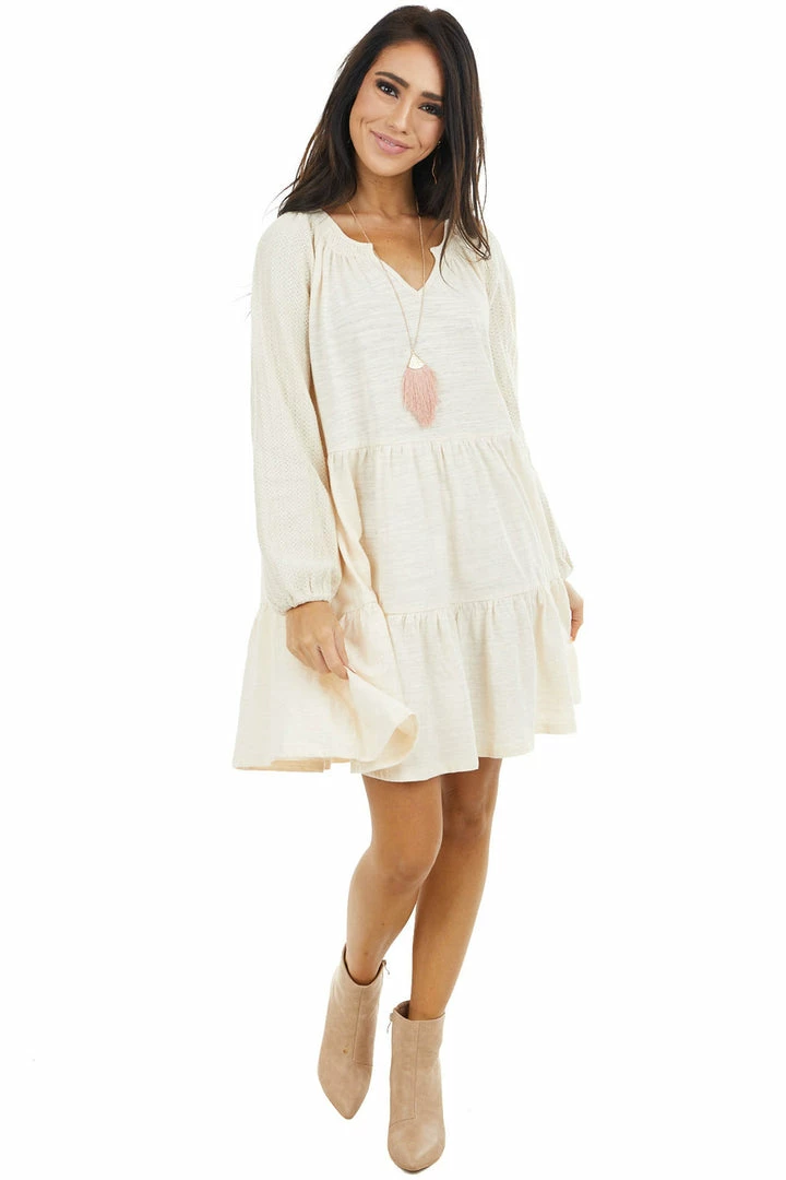 - Cream Tiered Mini Dress with Crochet Sleeves and V Neckline
