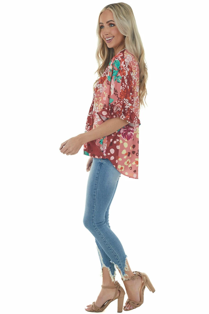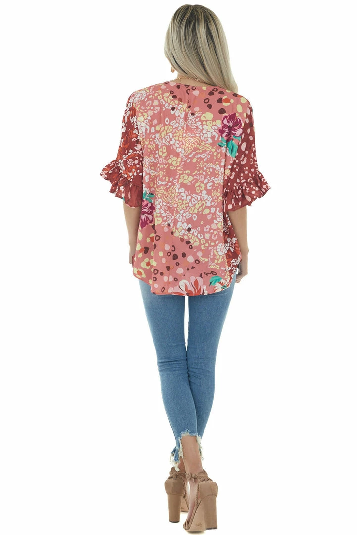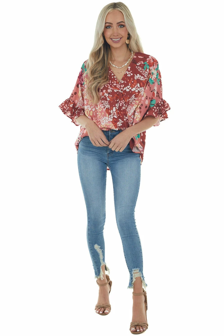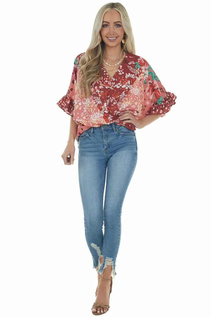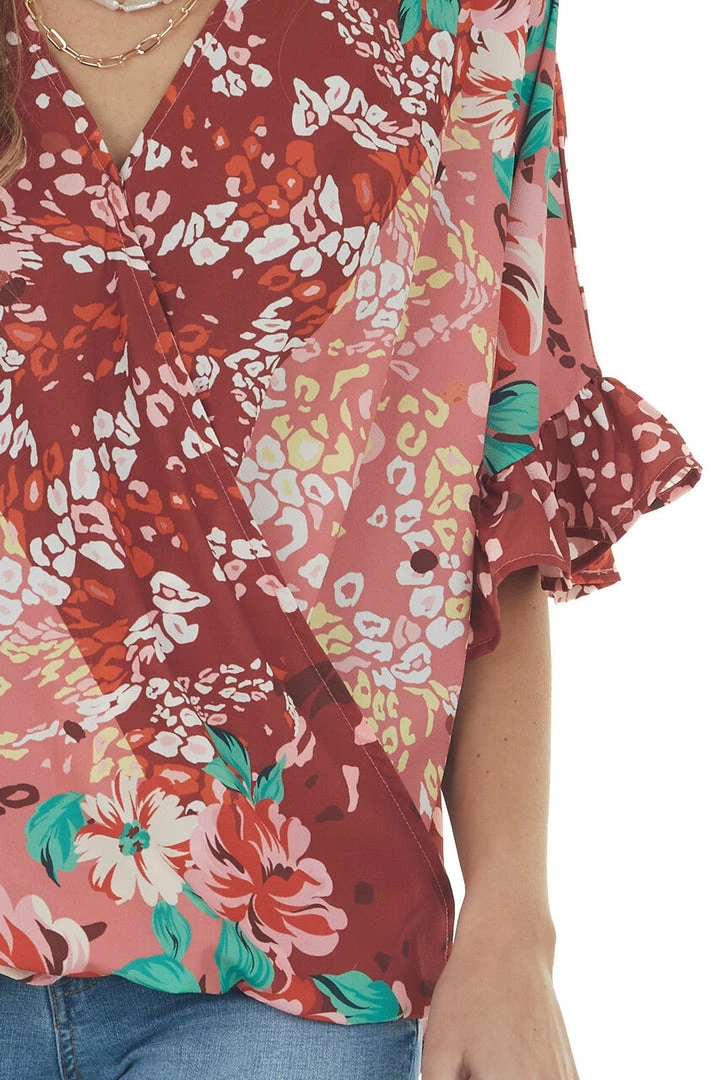 - Dark Rust Multiprint Short Sleeve Surplice Top