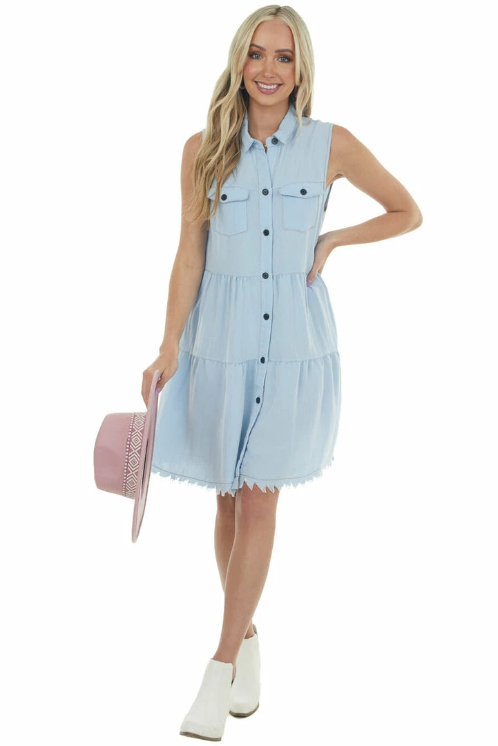 - Baby Blue Washed Button Down Frayed Hem Dress