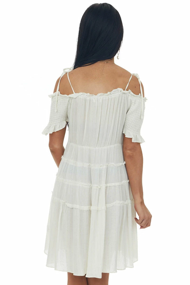 - Cream Gold Threaded Cold Shoulder Tiered Dress