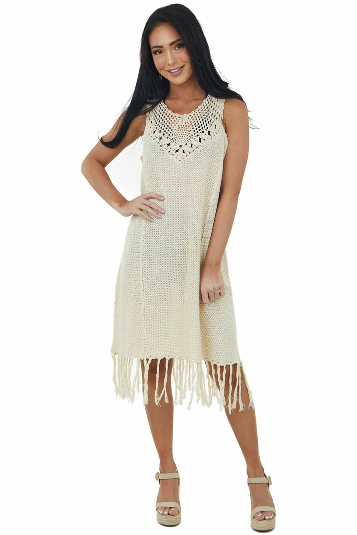 - Cream Tassel Hemline Crochet Knit Midi Dress