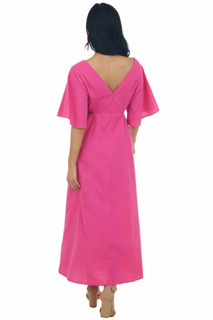 - Magenta Flare Sleeve Waist Cut Out Midi Dress