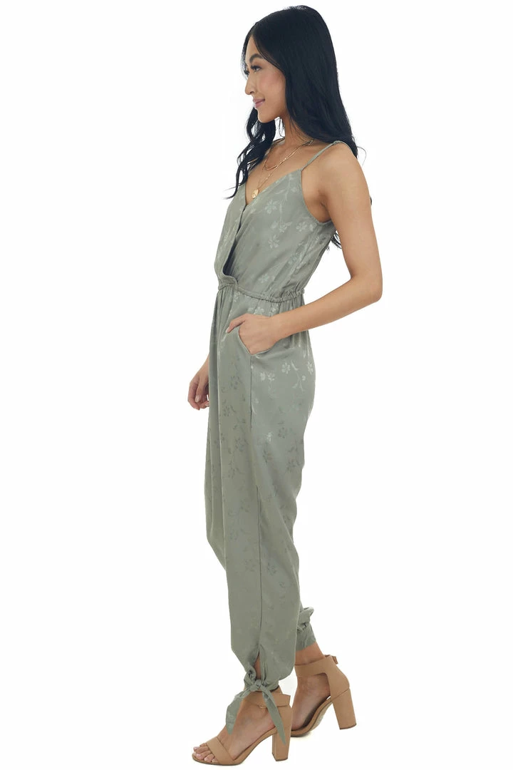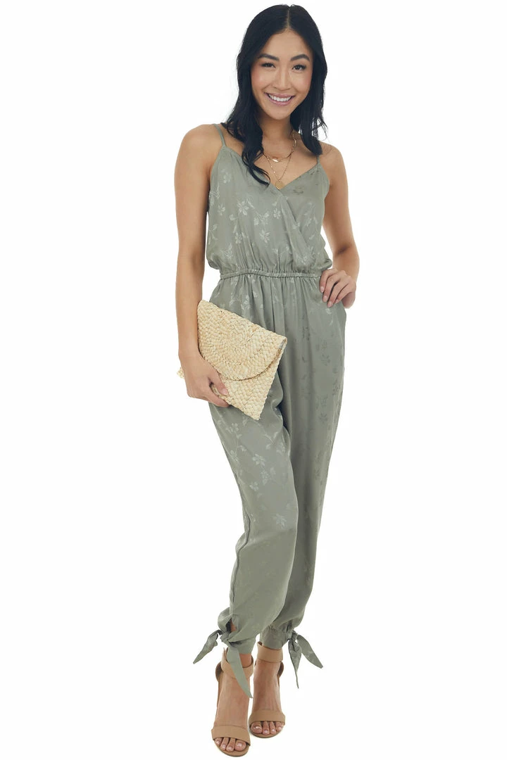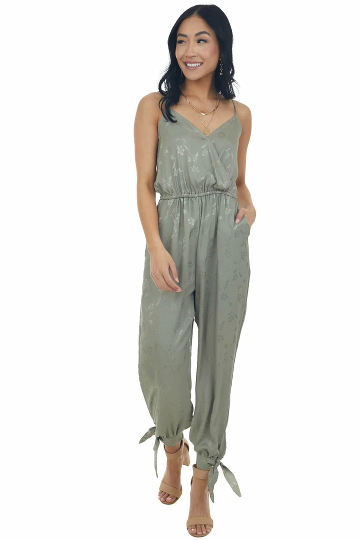- Olive Floral Textured Silky Surplice Jumpsuit