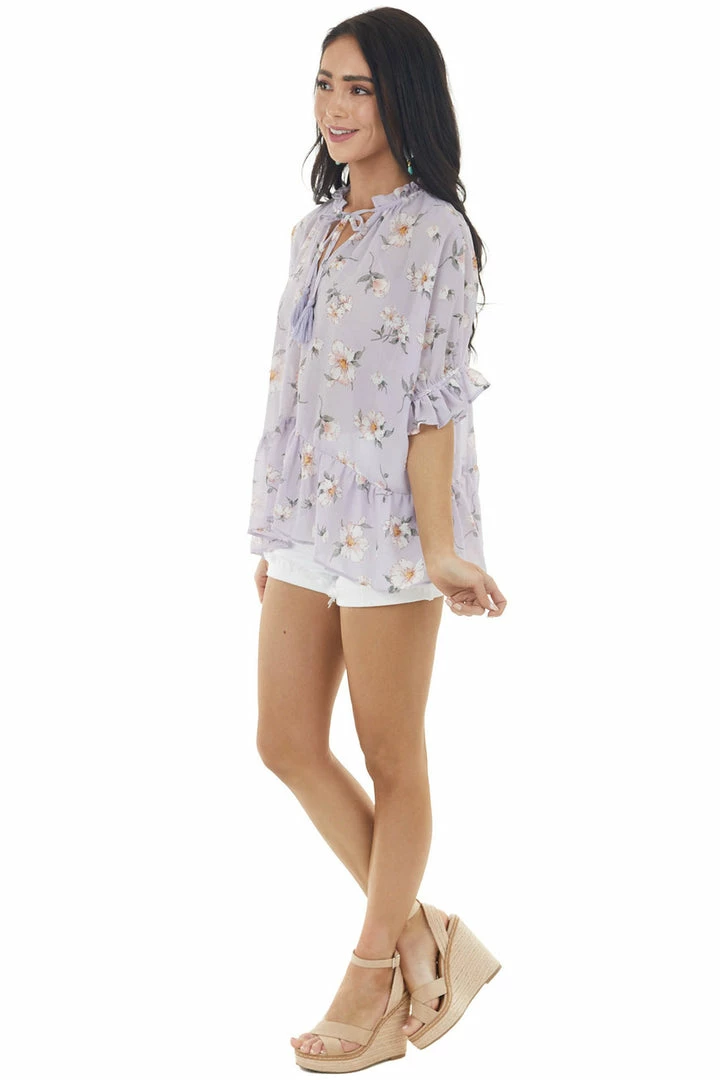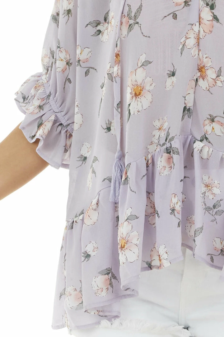 - Lavender Floral Print Drop Waist Ruffle Blouse with Tassels