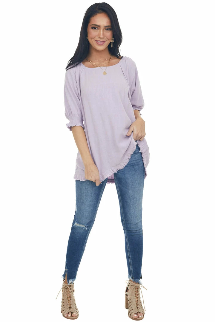 - Lilac Woven Half Bubble Sleeve Top with Frayed Hem