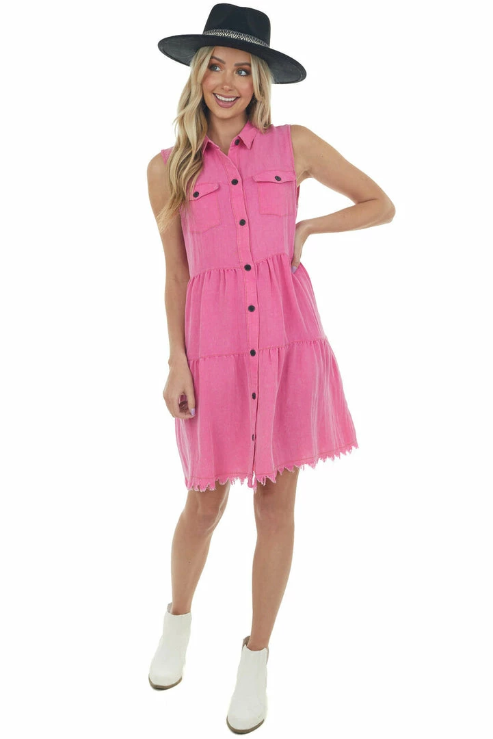 - Magenta Washed Button Down Frayed Hem Dress