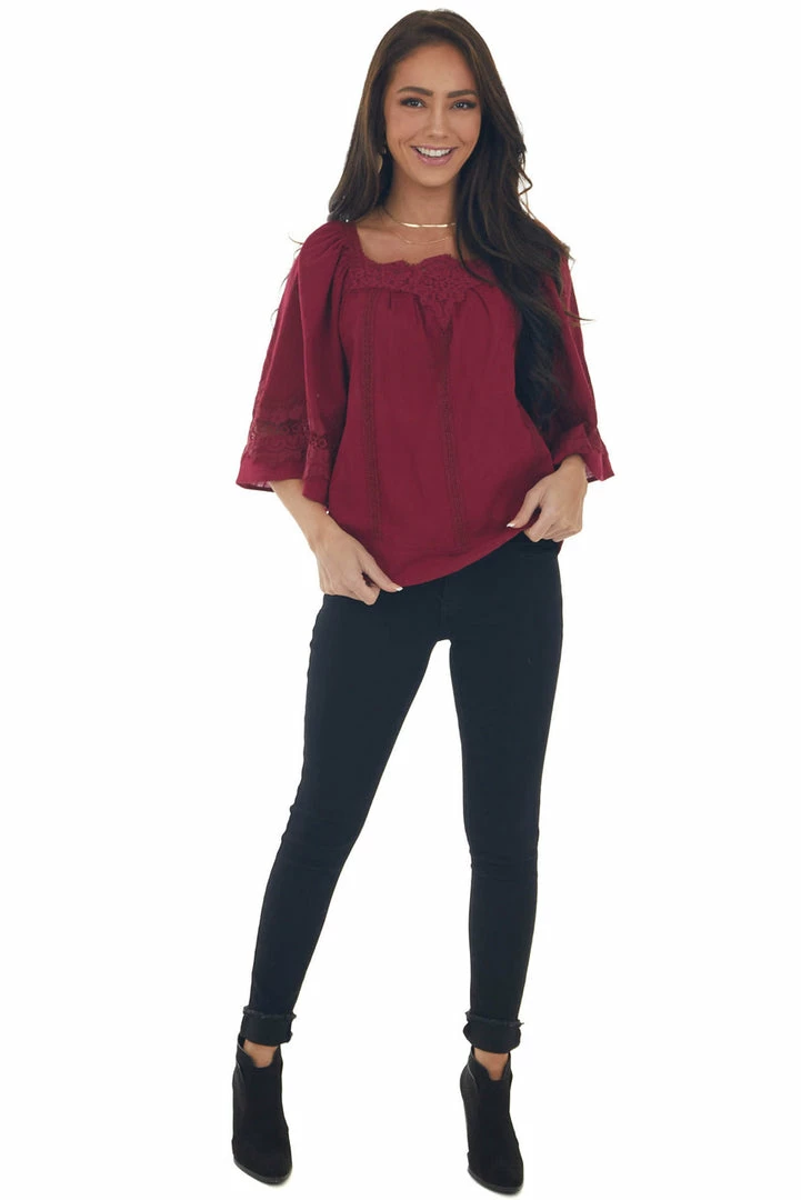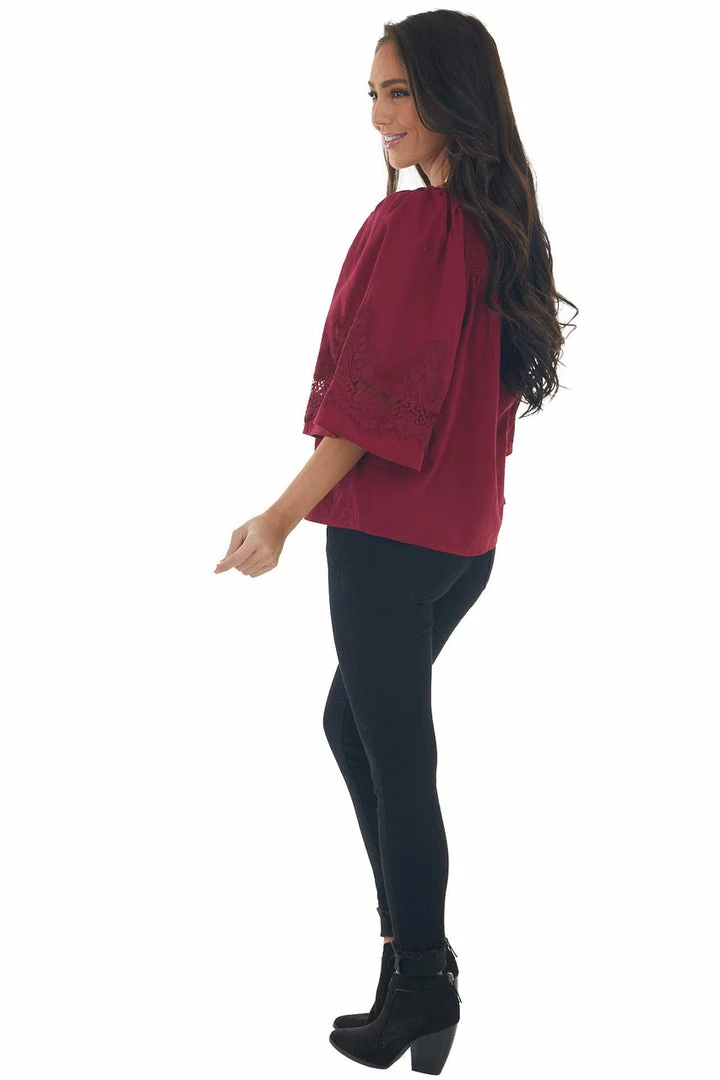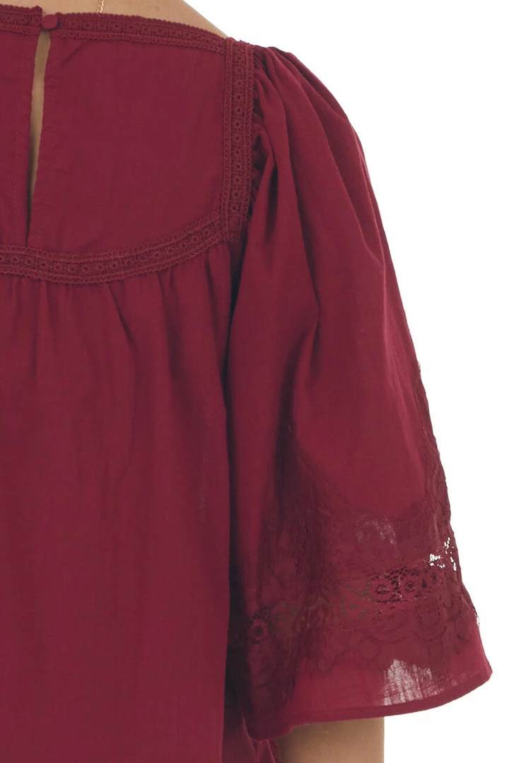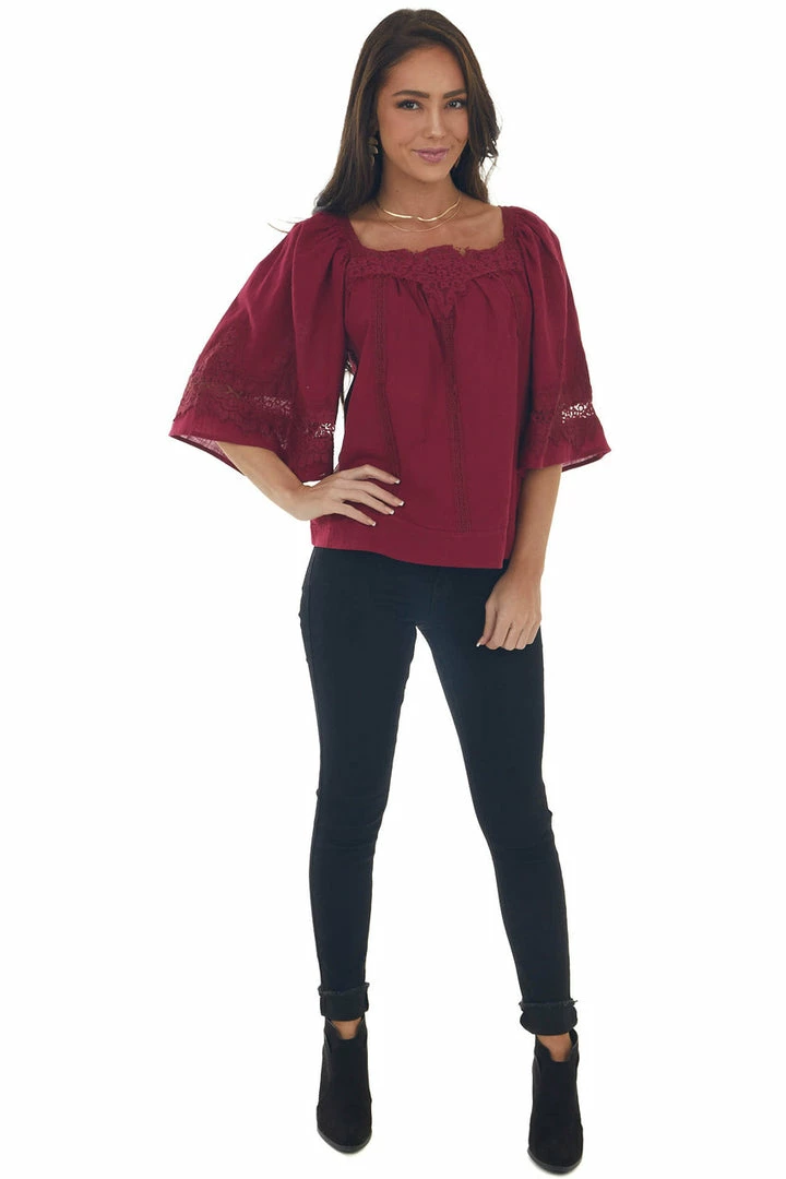 - Maroon Flare Sleeve Lace Trim Blouse