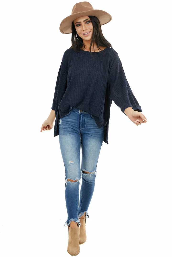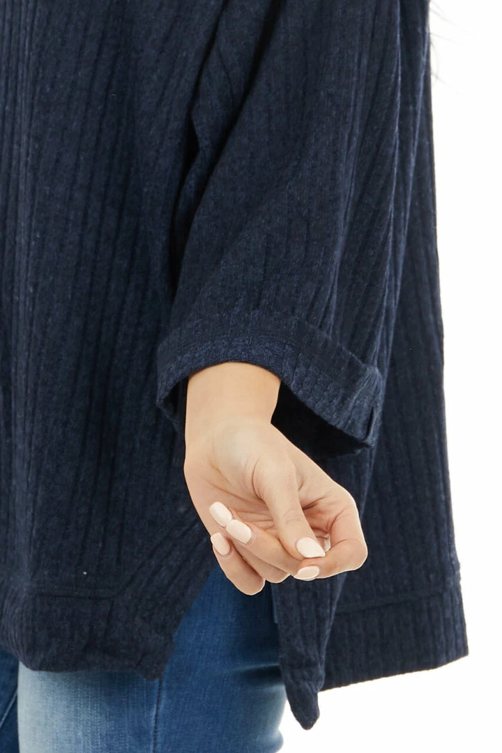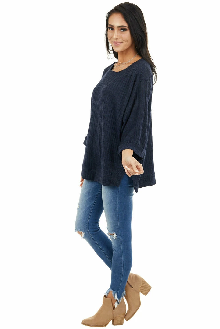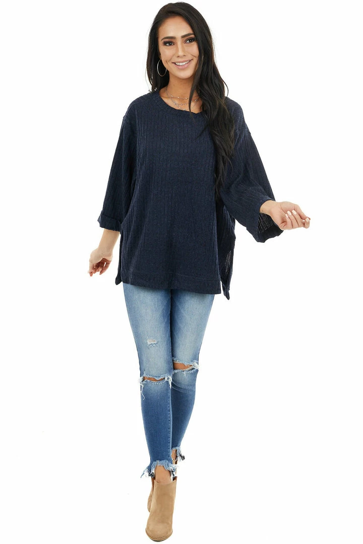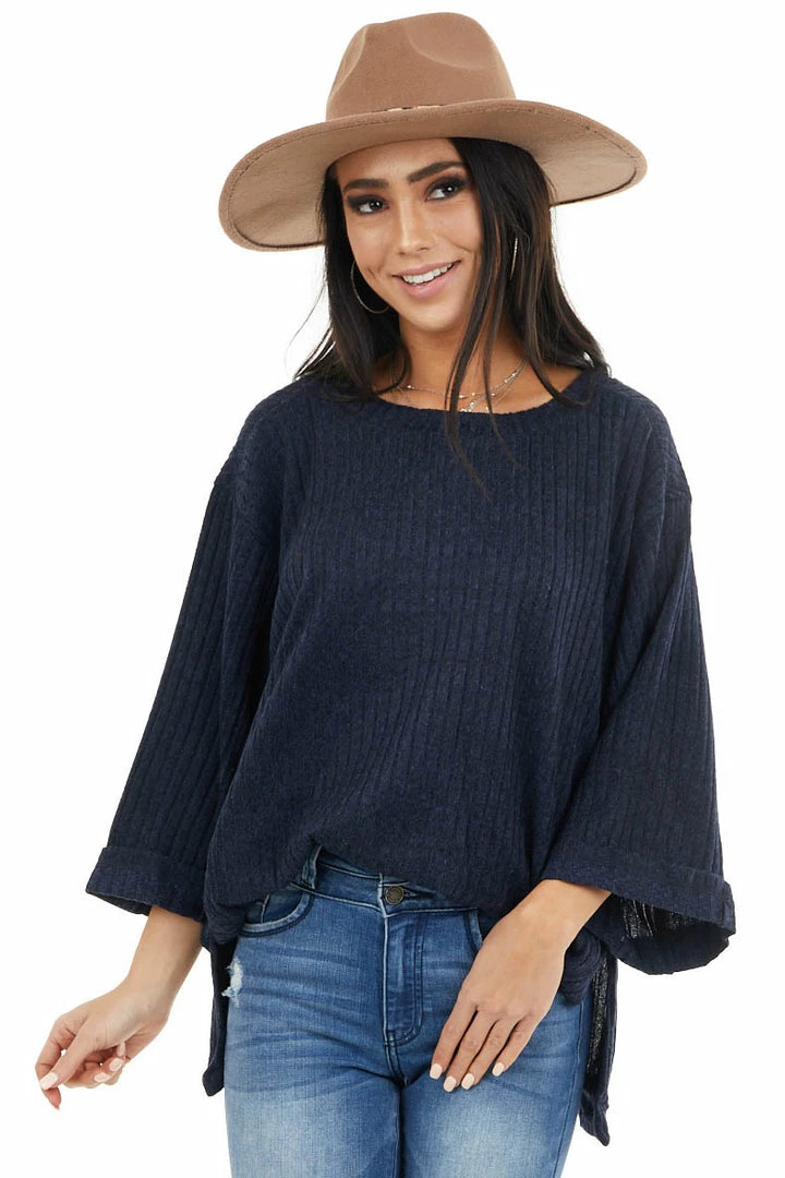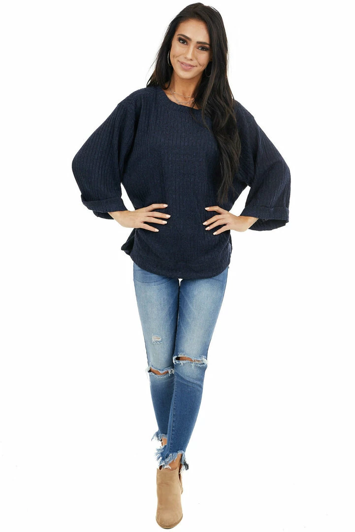 - Navy Blue Ribbed Loose Knit Top with Wide Sleeves