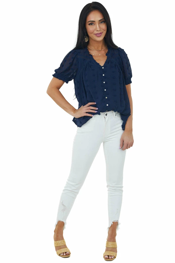 - Navy Swiss Dot Short Puff Sleeve Button Detail Top