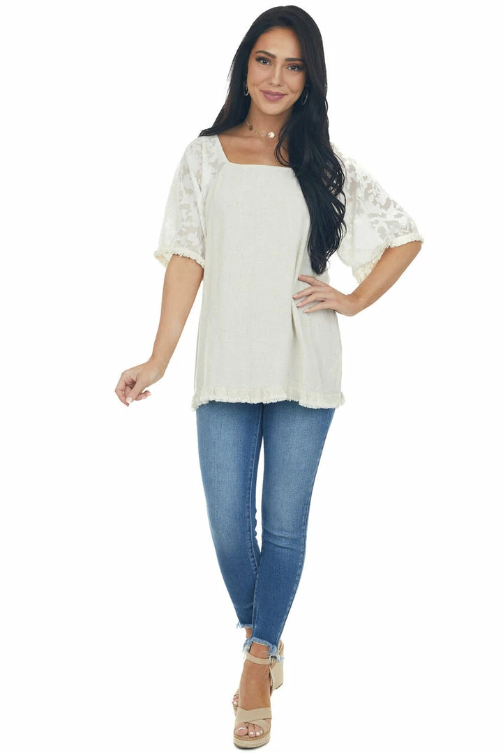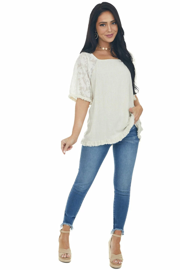 - Oatmeal Floral Textured Mesh Sleeve Blouse
