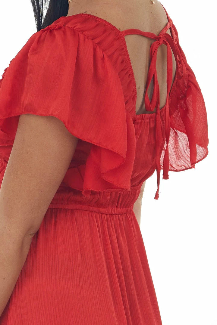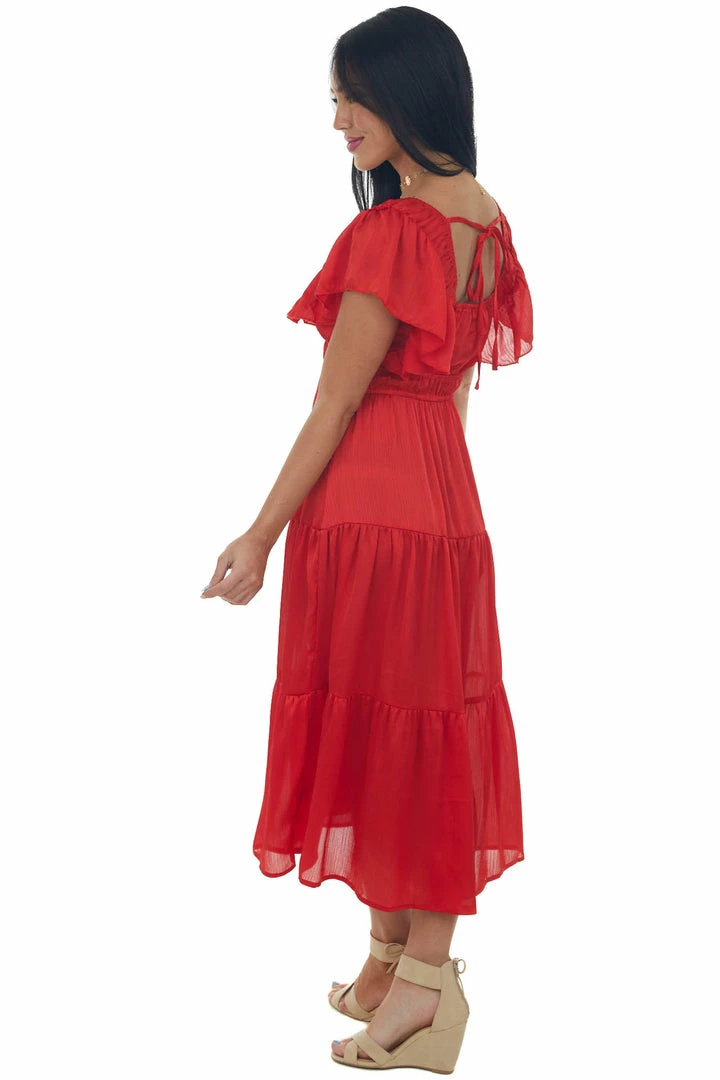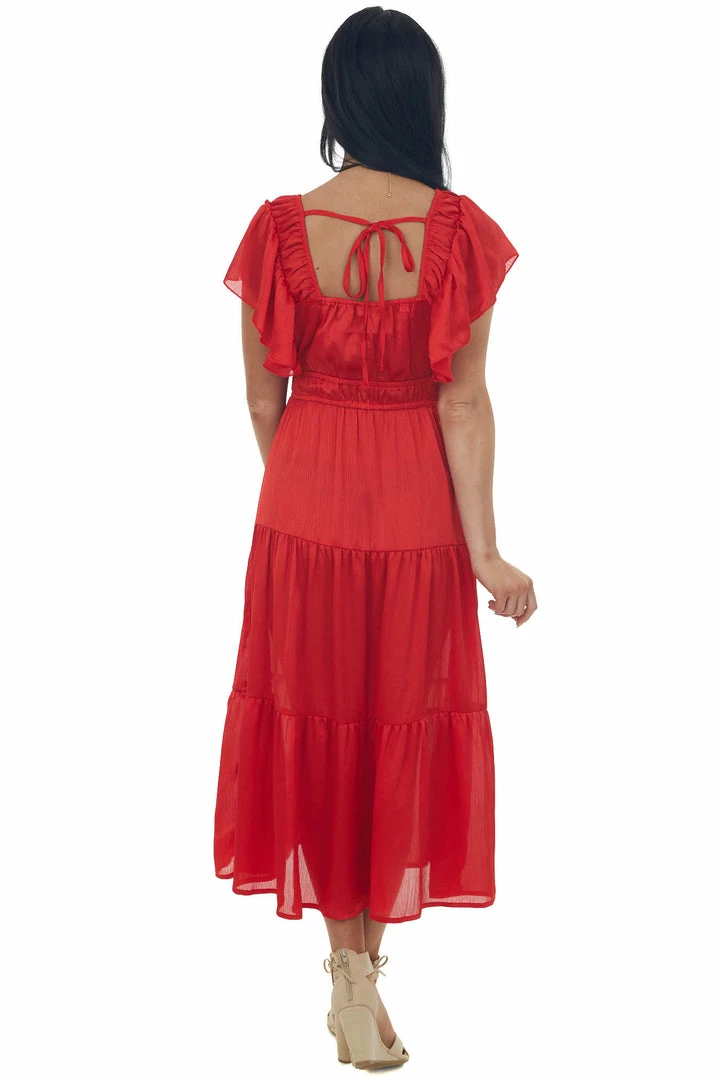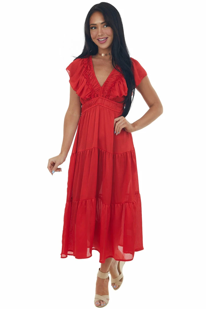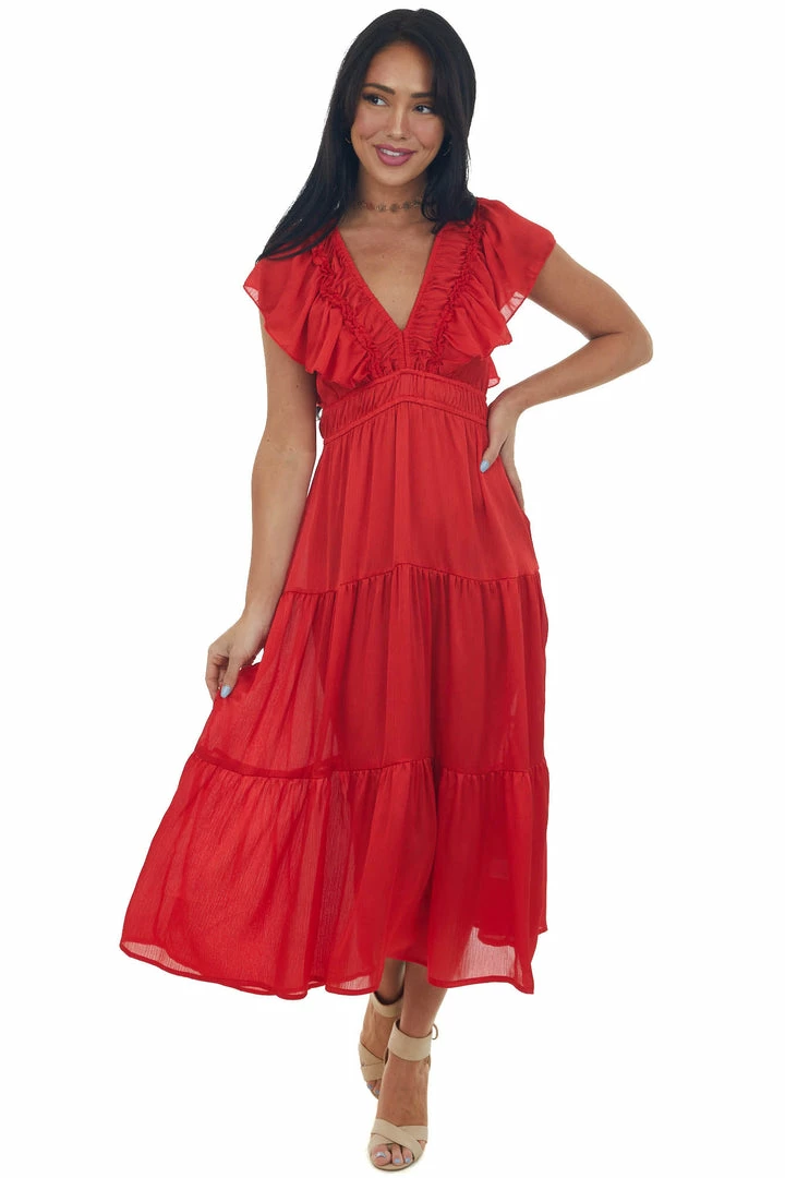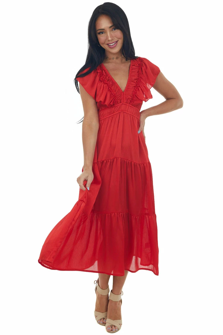 - Pomegranate V Neck Ruffle Sleeve Tiered Midi Dress