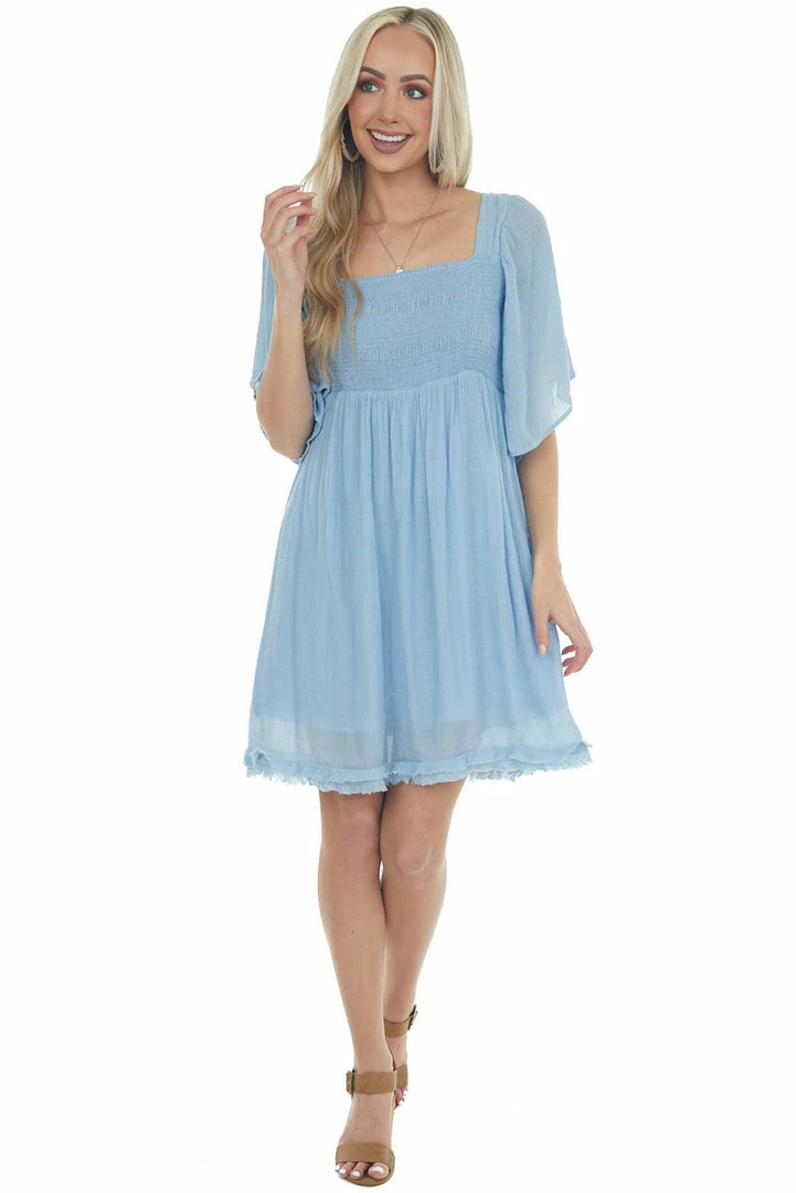 - Powder Blue Babydoll Short Dress with Flutter Sleeves