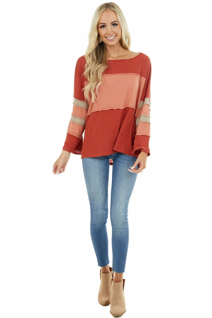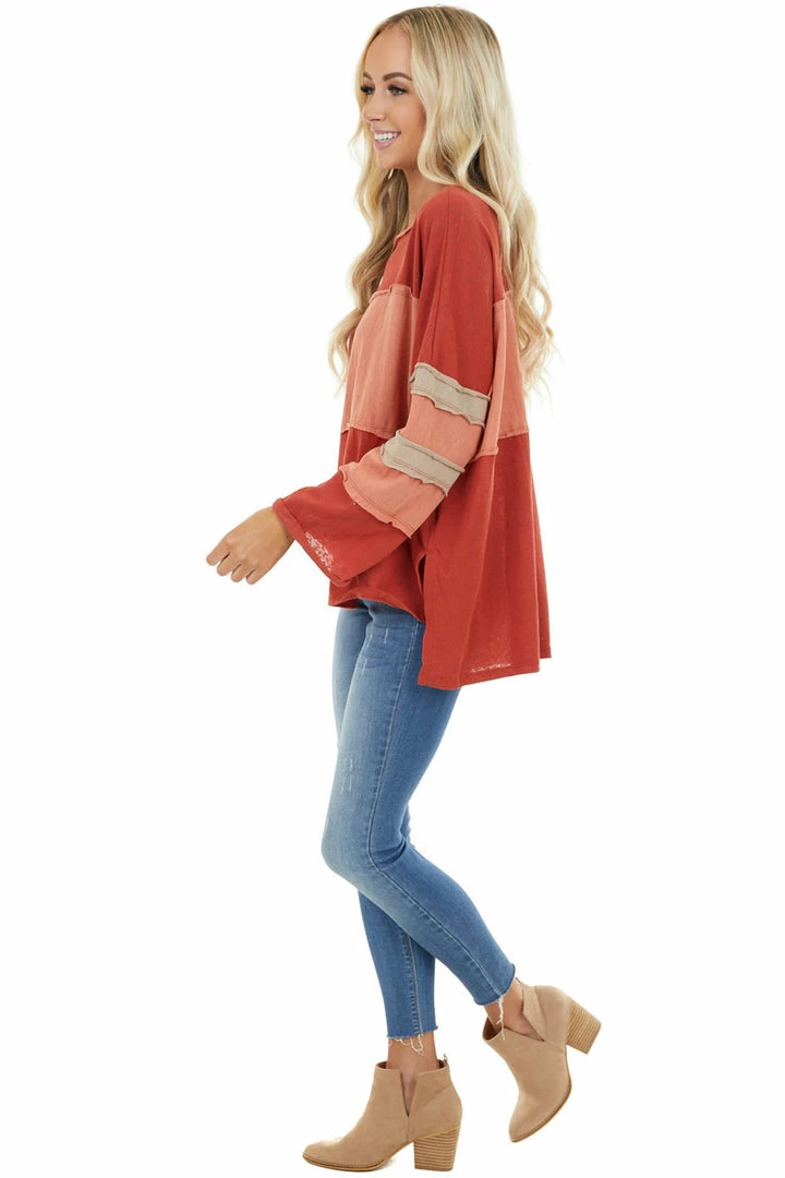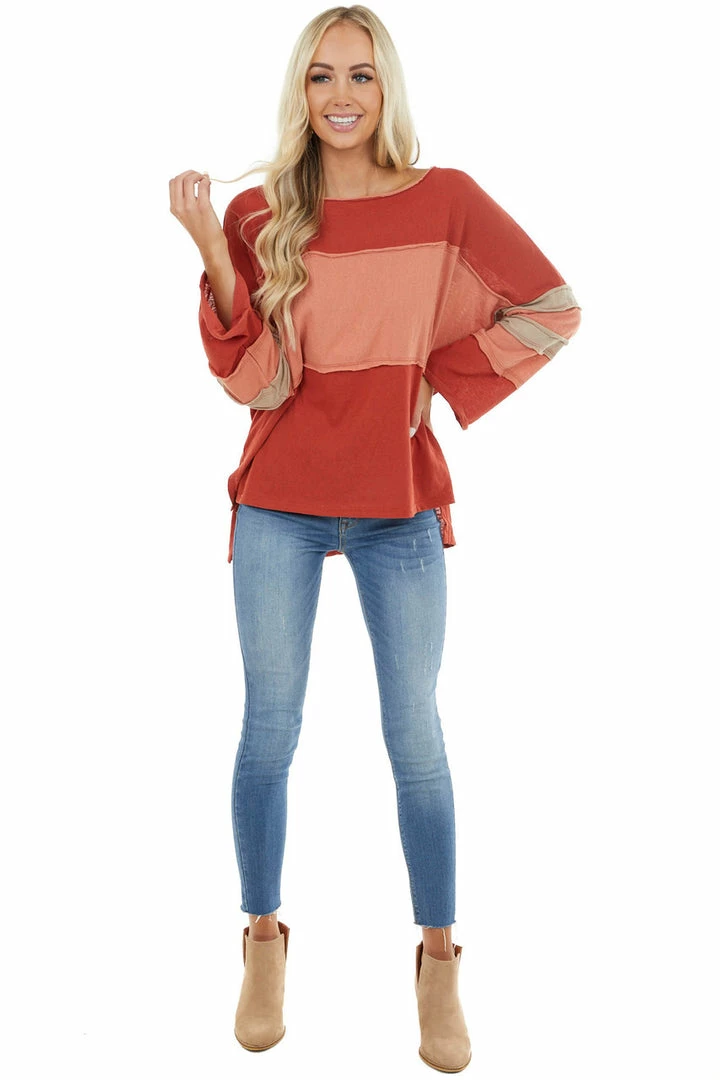 - Rust and Apricot Top with Raw Hem Details and Side Slits