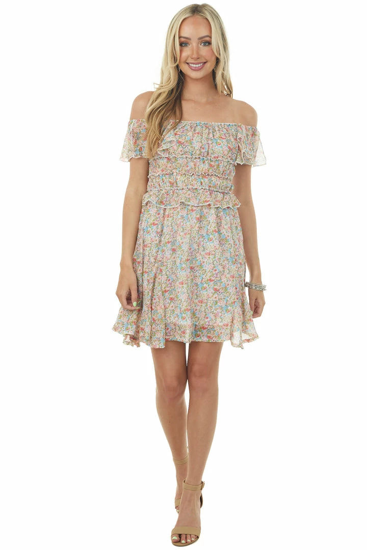 - Sky Blue Floral Print Short Ruffle Sleeve Dress