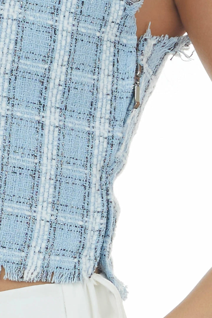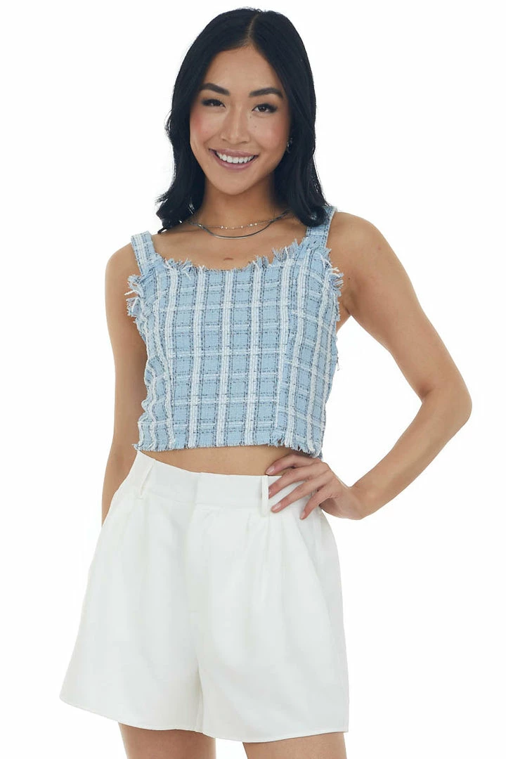 - Baby Blue Plaid Metallic Raw Detail Tank Top