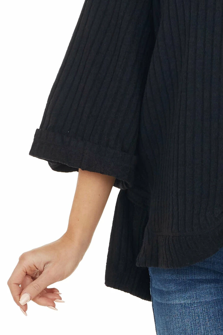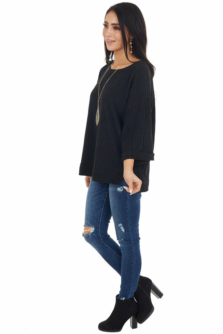 - Black Ribbed Loose Knit Top with Wide Sleeves