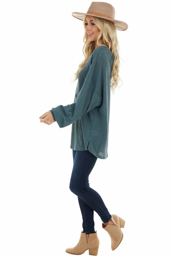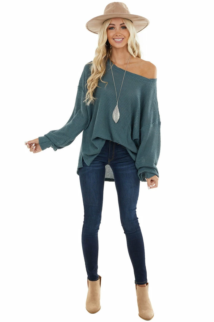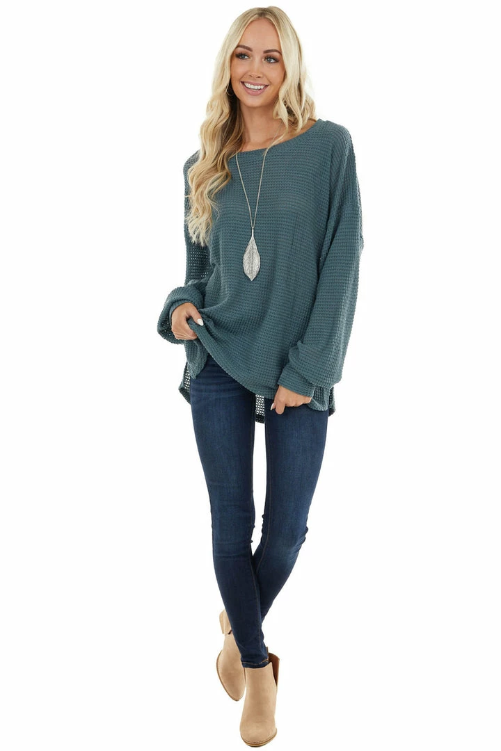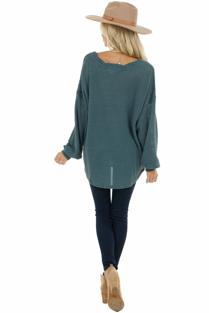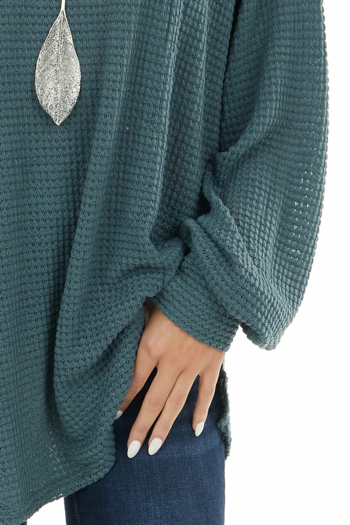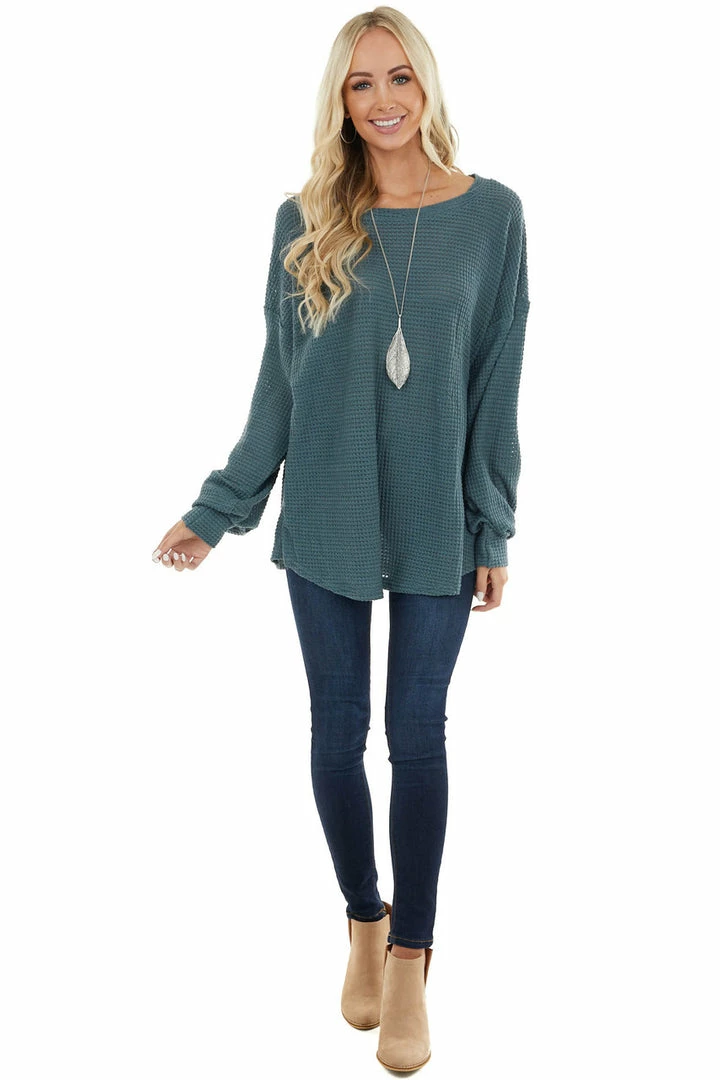 - Dark Teal Oversized Waffle Knit Top with Bubble Sleeves