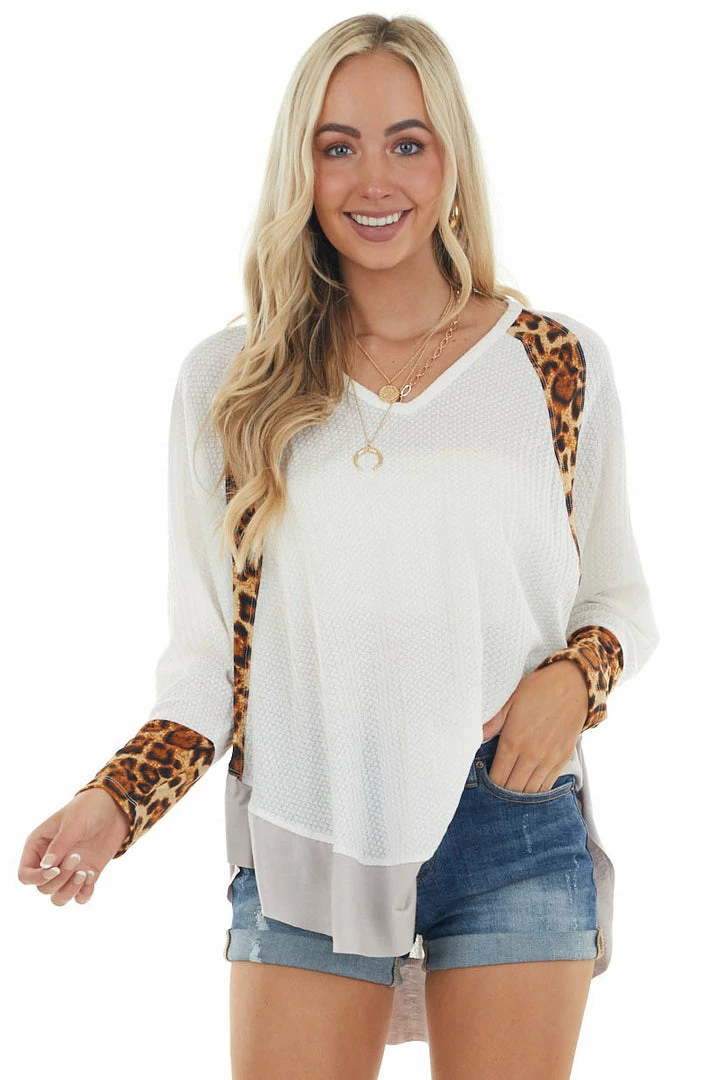 - Ivory Long Sleeve Waffle Knit Top with Leopard Contrast