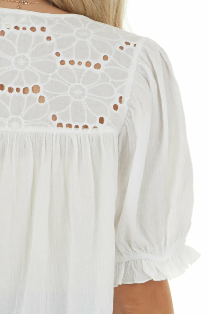 - Off White Split Neck Blouse with Eyelet Lace