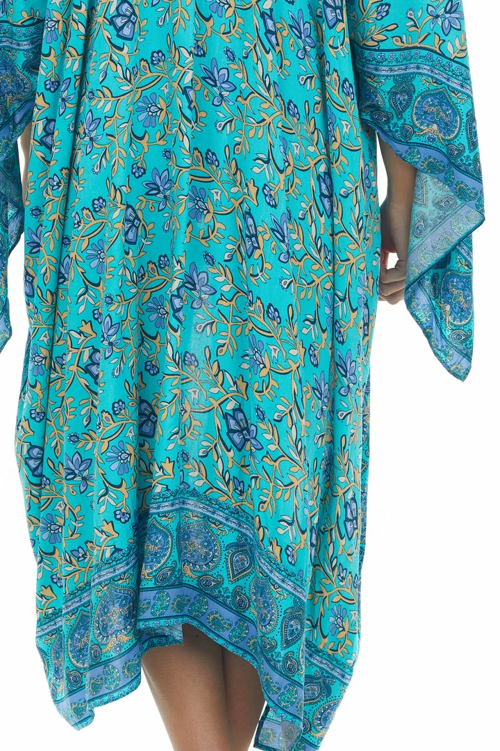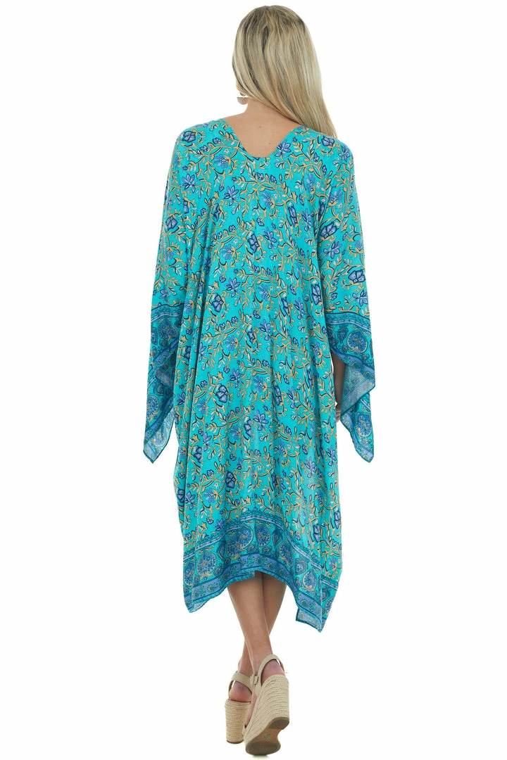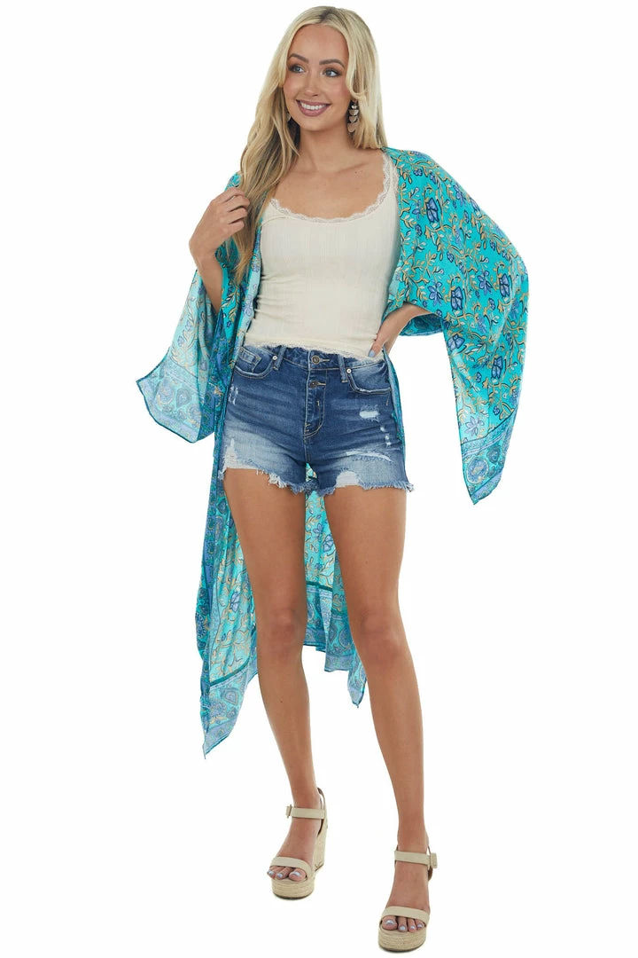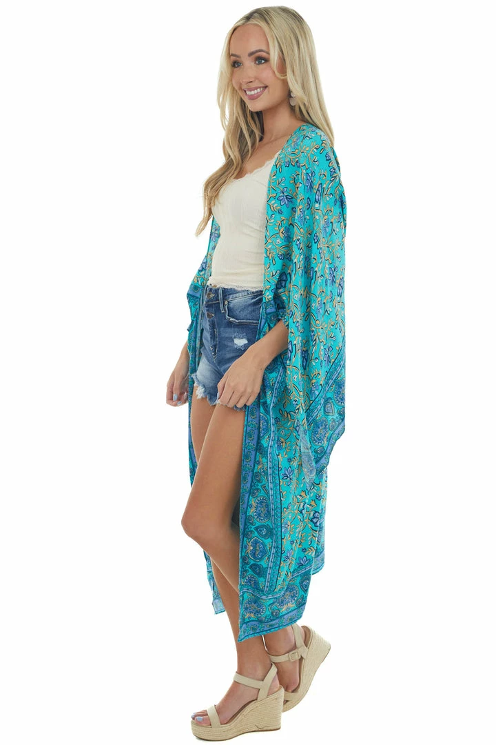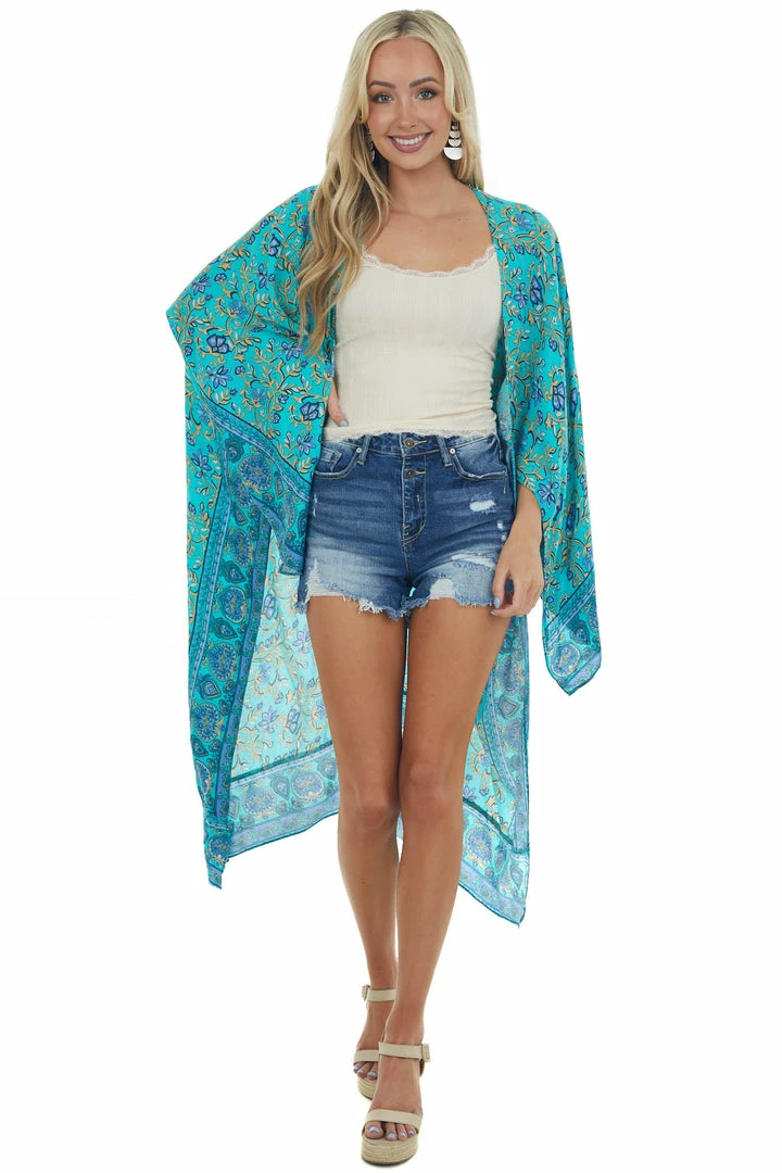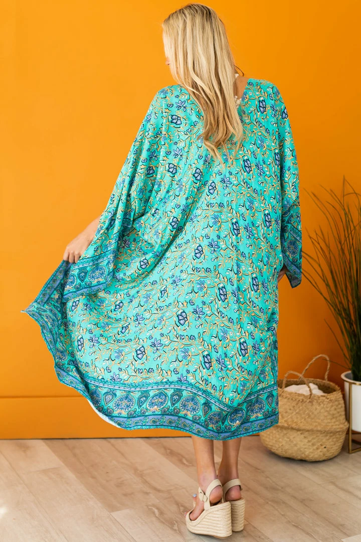 - Turquoise Printed Wing Sleeve Duster Kimono