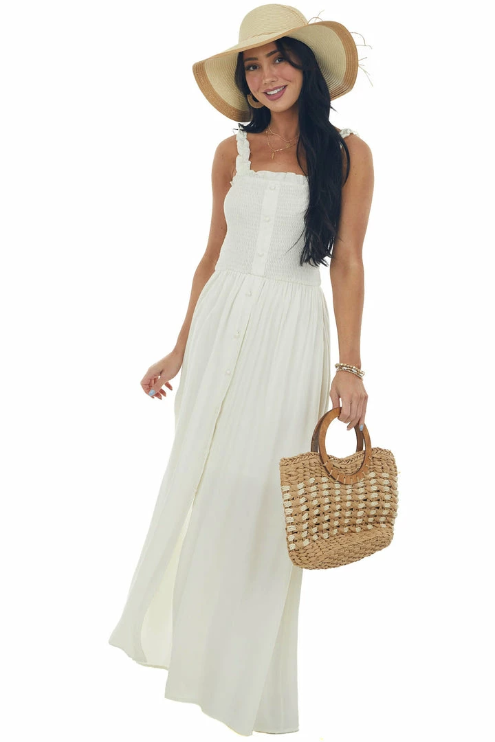 - Cream Smocked Bodice Front Slit Maxi Dress