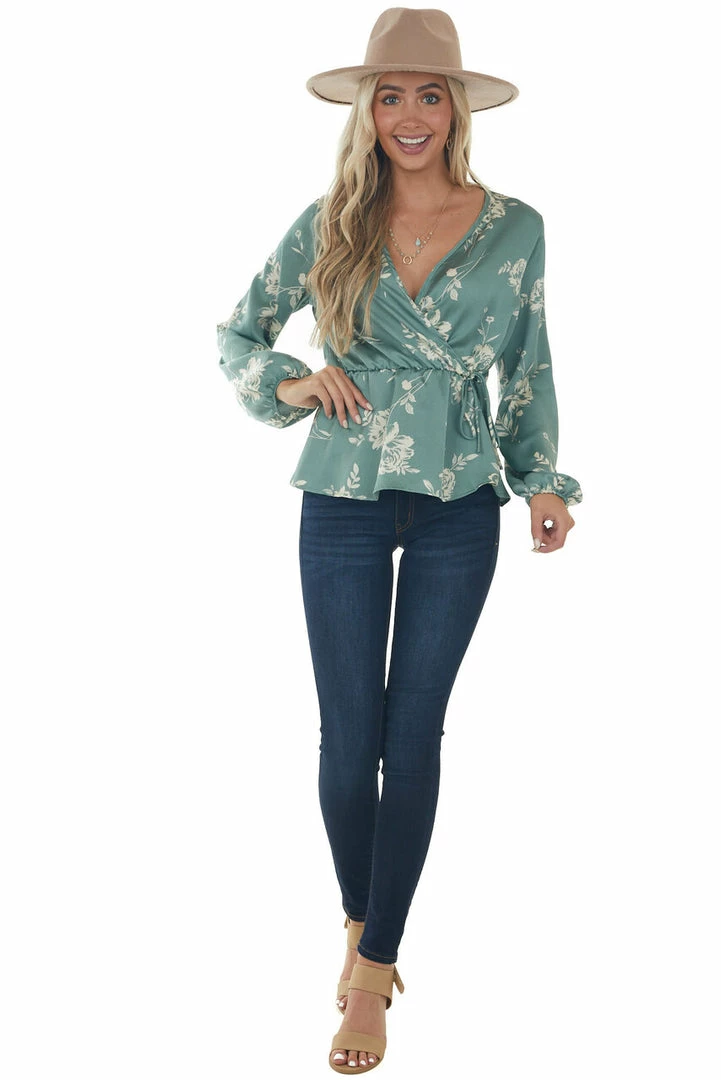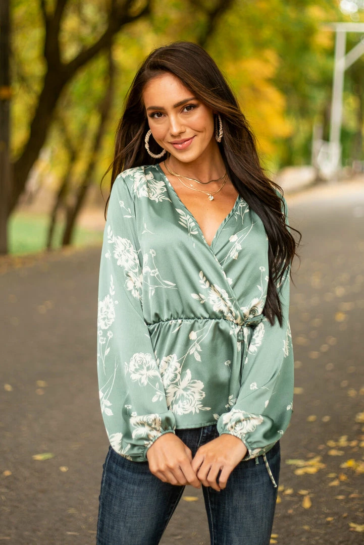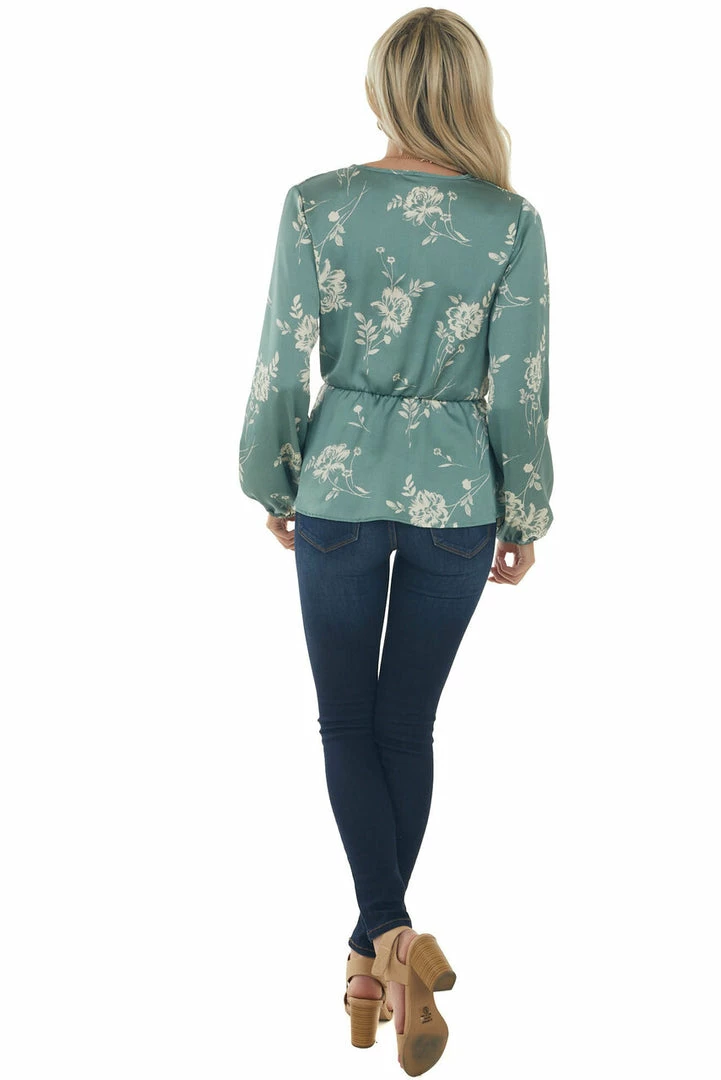- Deep Sage Floral Print Long Sleeve Peplum Top