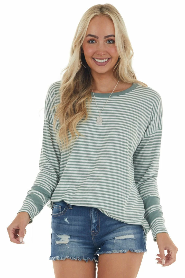 - Sage Green Striped Print Long Sleeve Knit Top