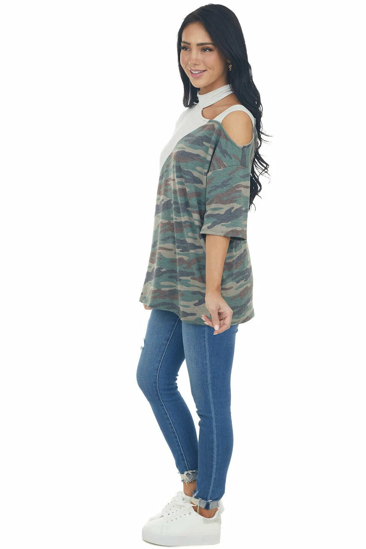 - Pewter Grey Cold Shoulder Top with Asymmetrical Camo Print