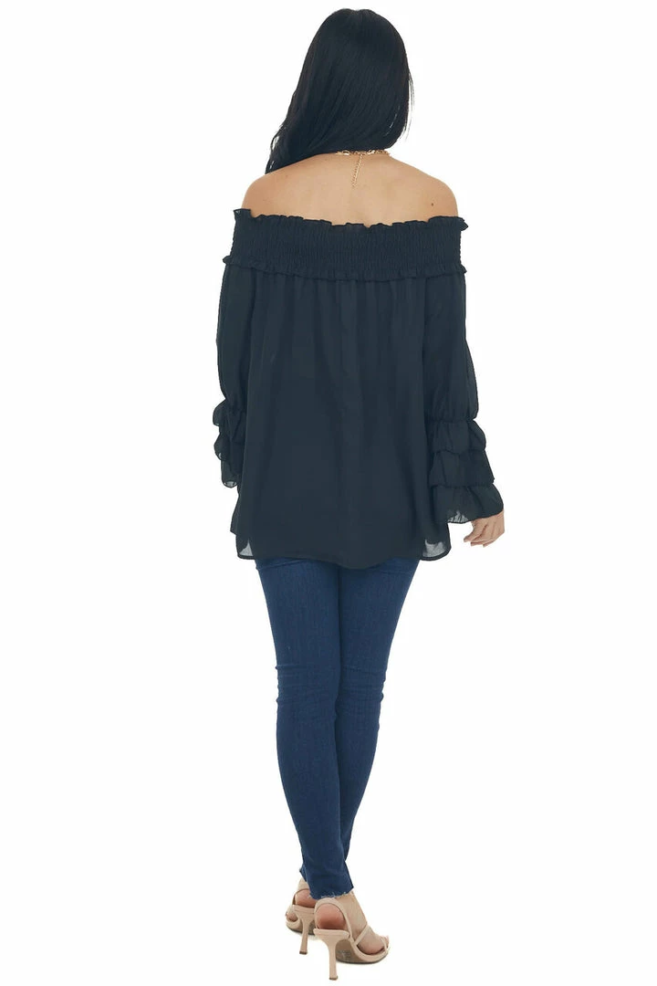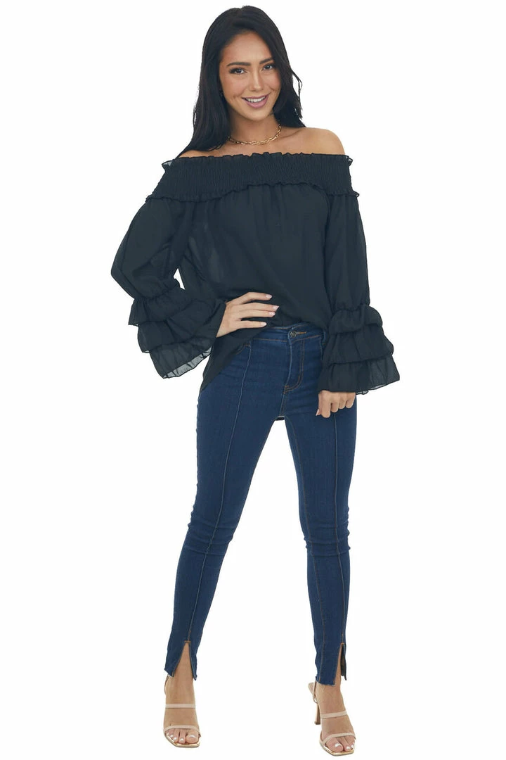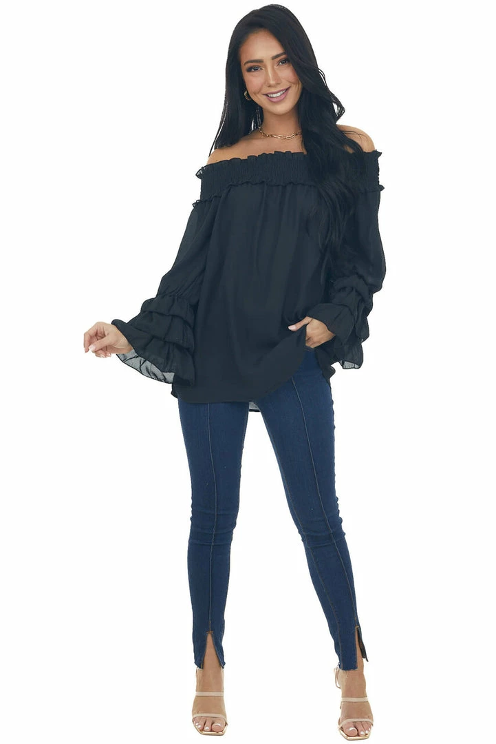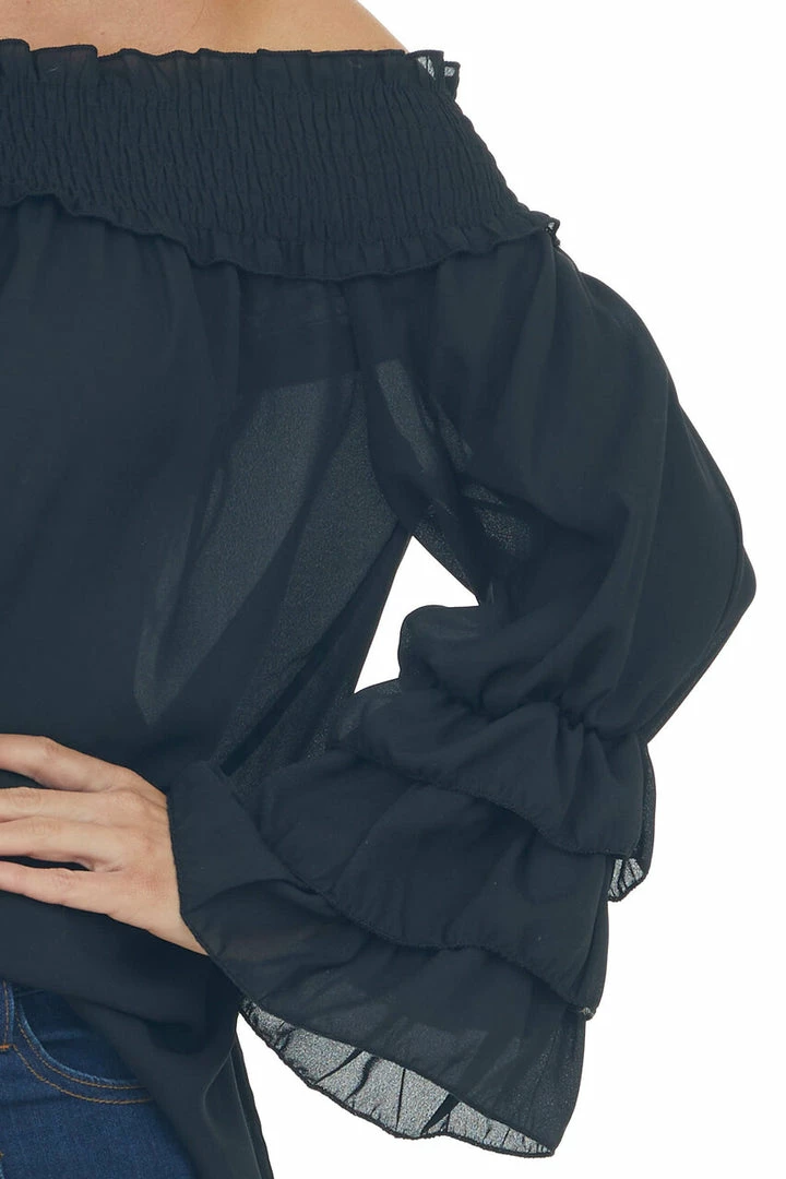 - Black Off Shoulder Tiered Bell Sleeve Blouse