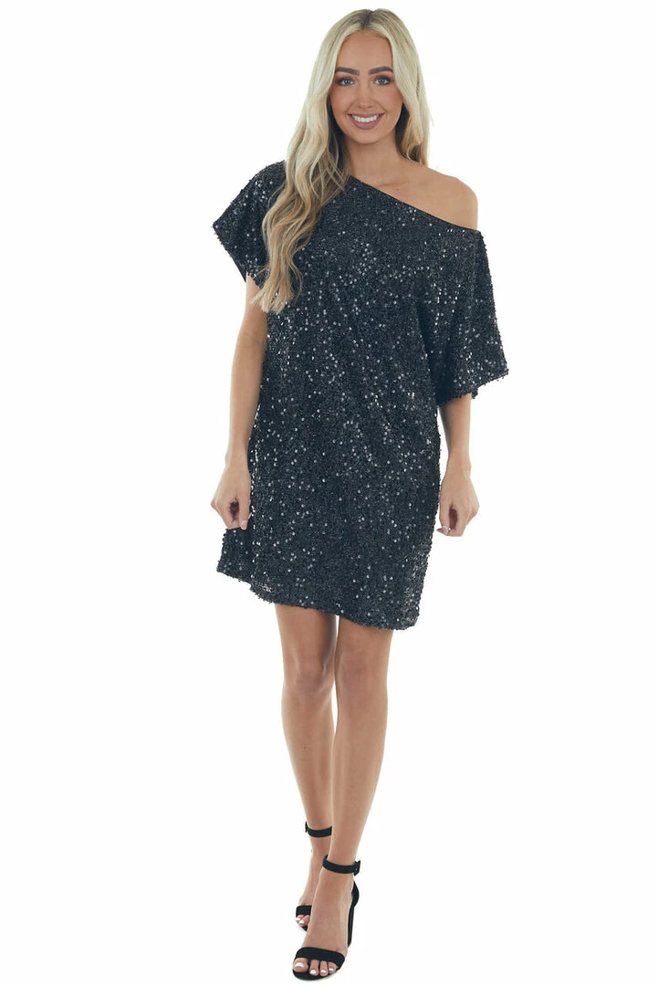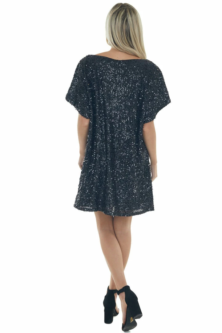 - Black Sequined Short Flowy Sleeve Shift Dress