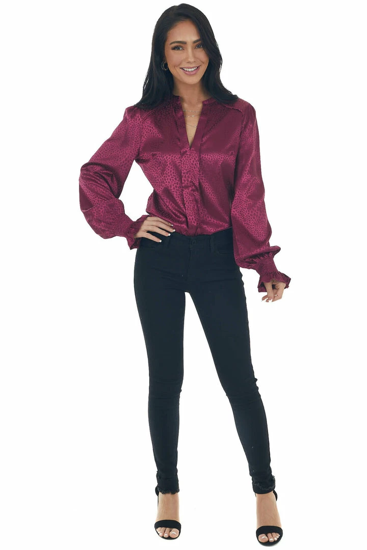 - Burgundy Animal Print Notch Neck Satin Blouse