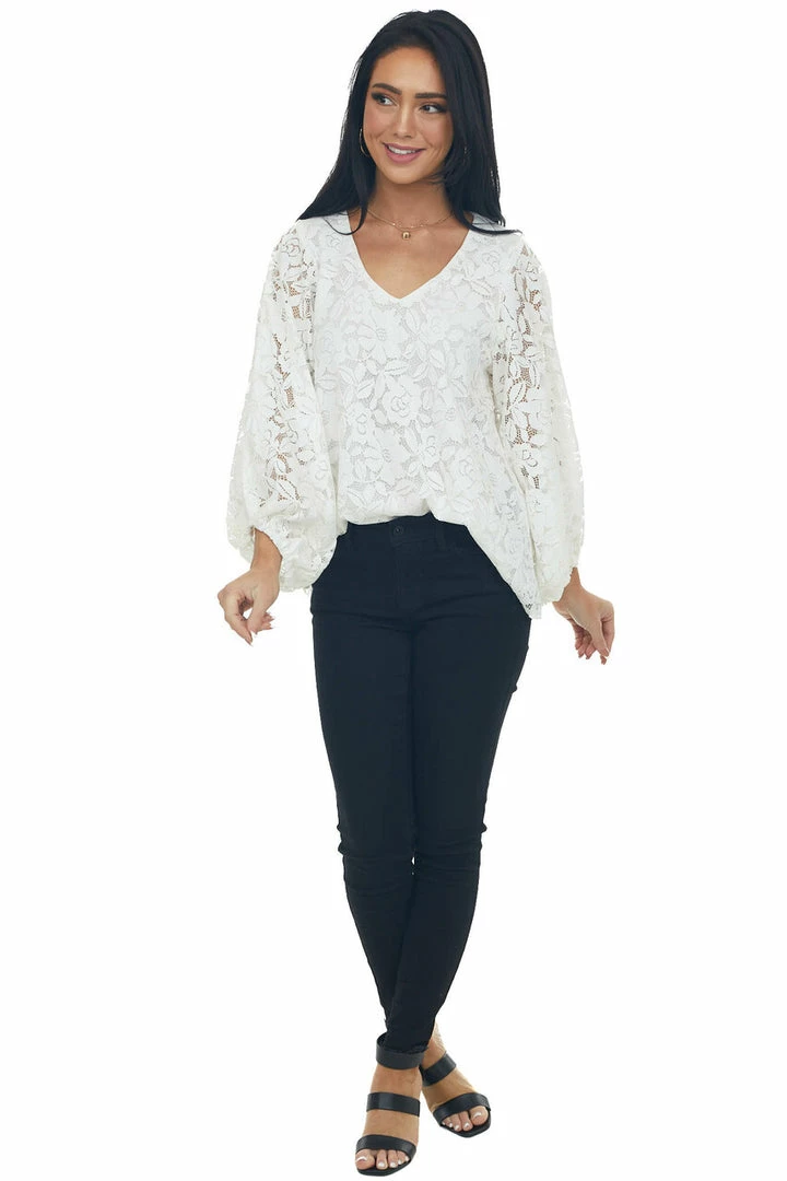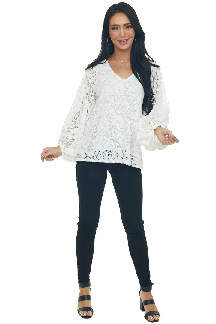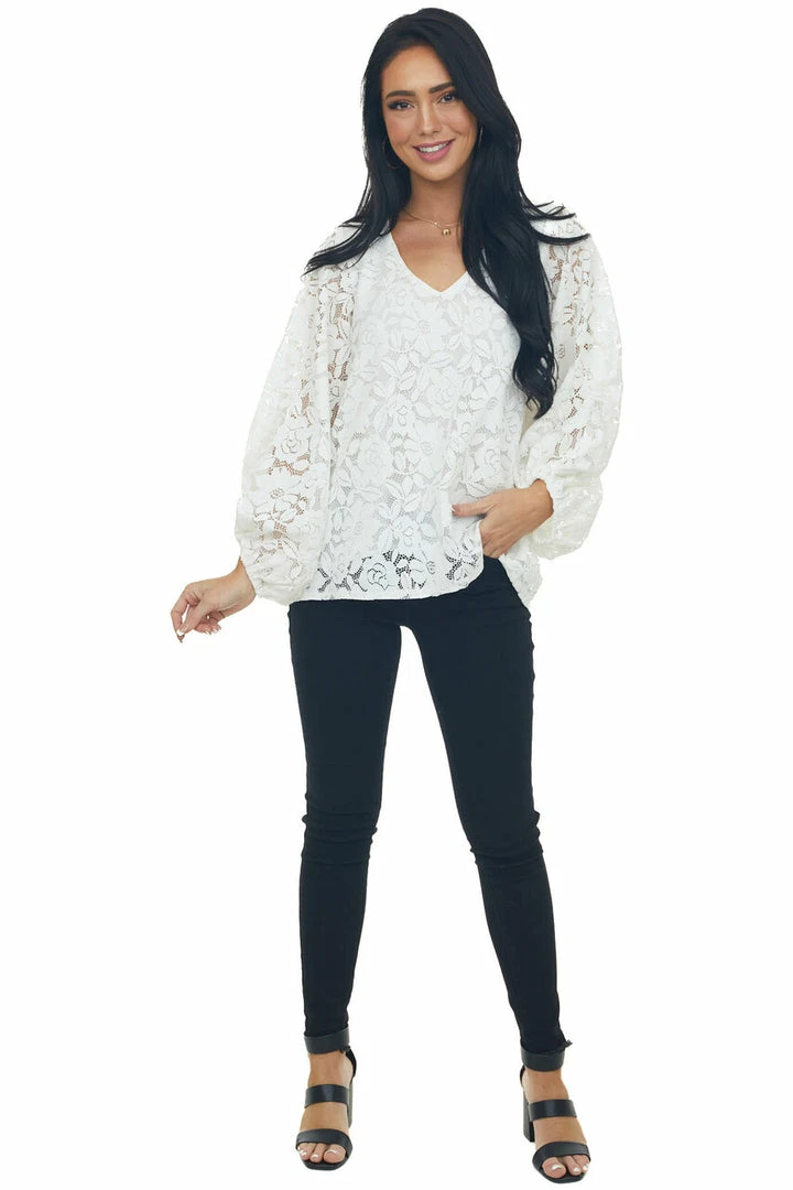 - Ivory Floral Lace Long Bubble Sleeve Blouse