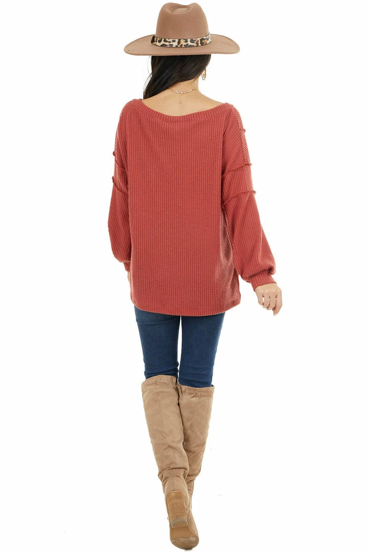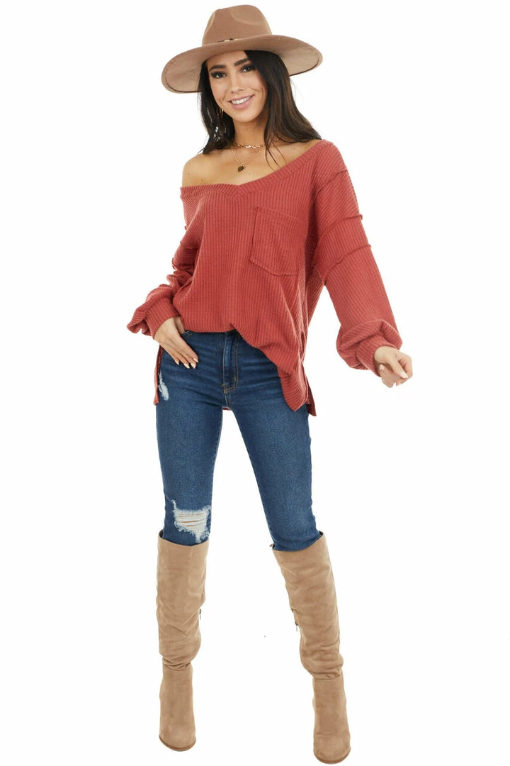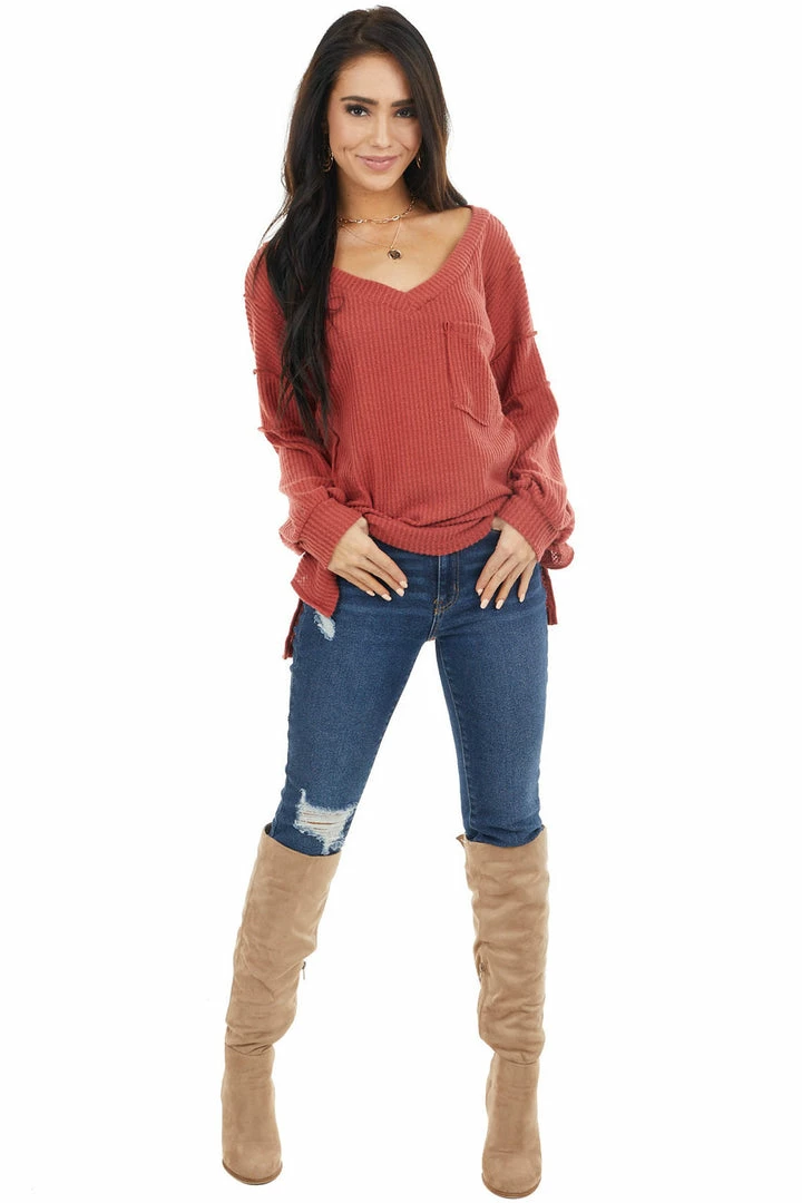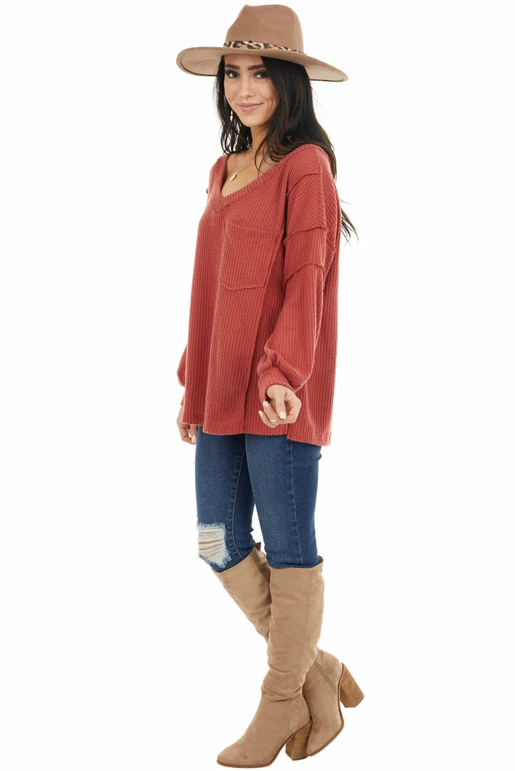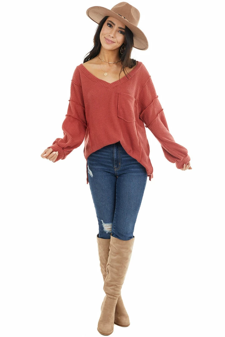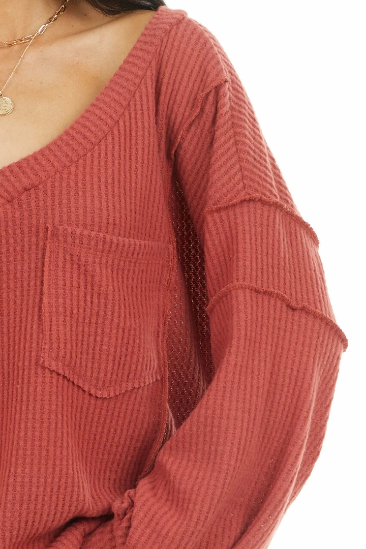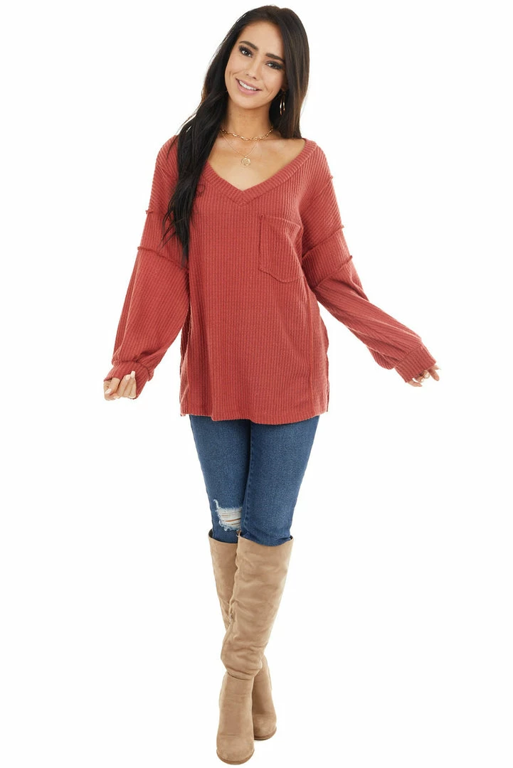 - Rust Long Sleeve Waffle Knit Top with Pocket and Side Slits