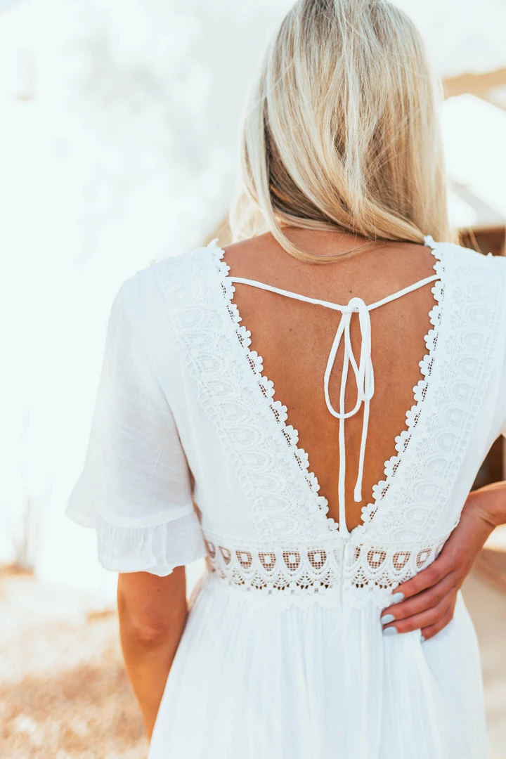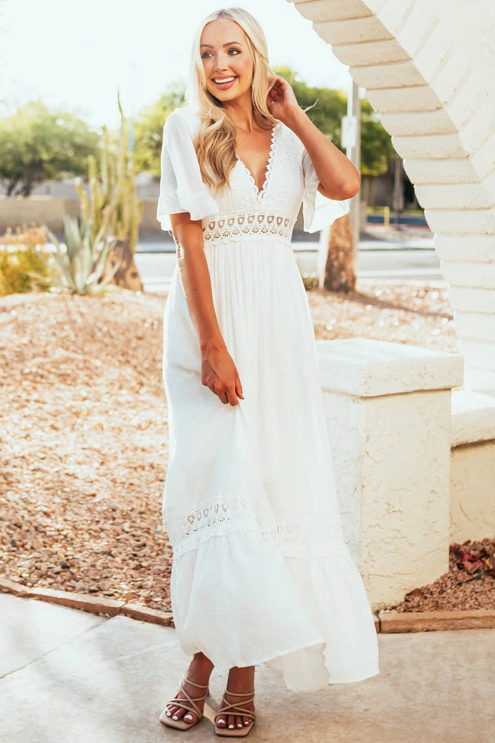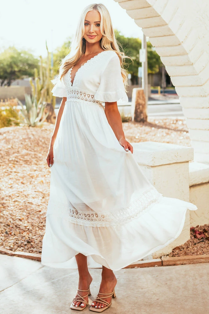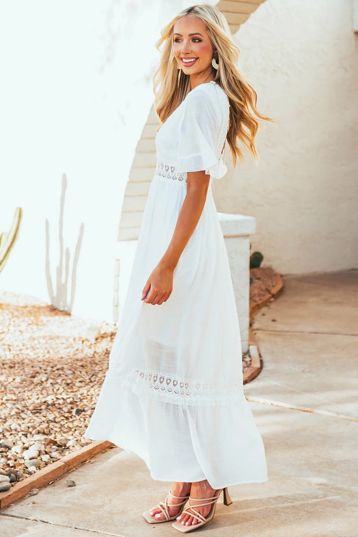 - Off White Short Ruffle Sleeve Maxi Dress with Lace Details