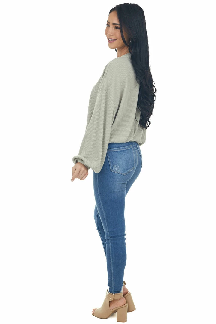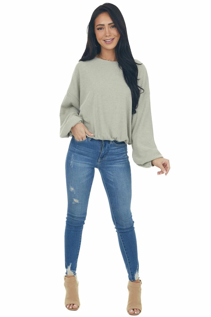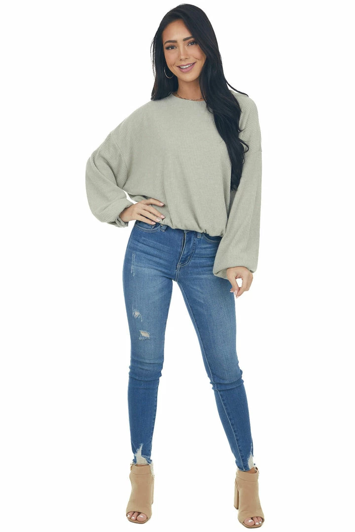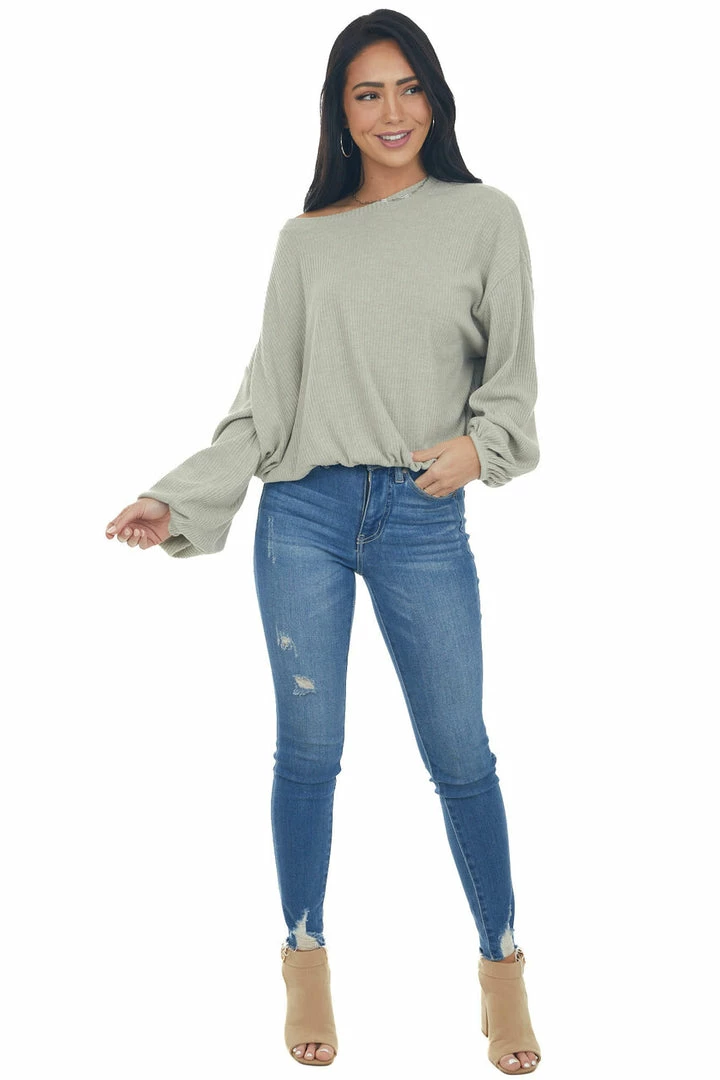 - Olive Green Long Bubble Sleeve Stretchy Ribbed Knit Top