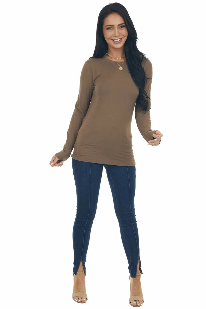 - Coffee Solid Soft Knit Top with Long Sleeves