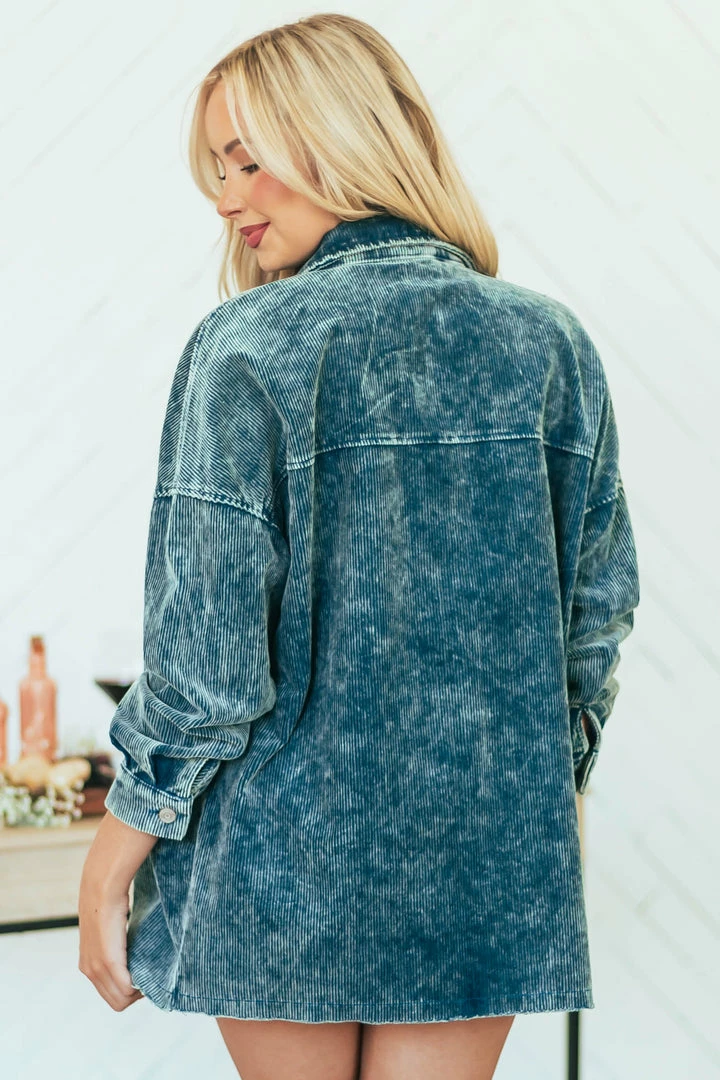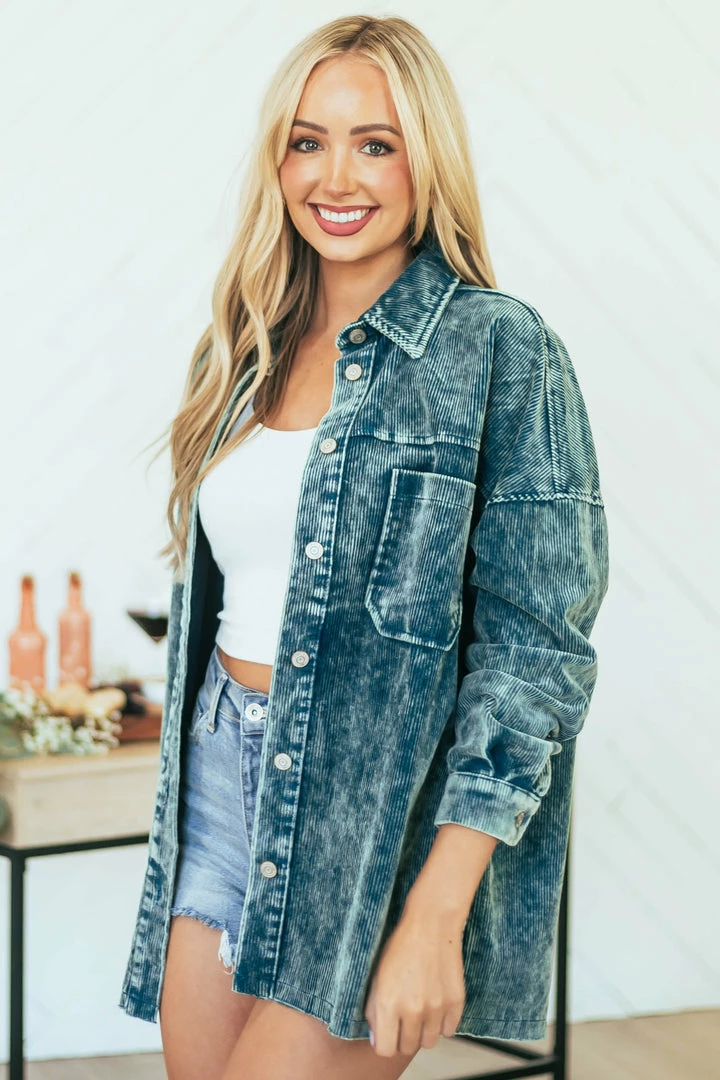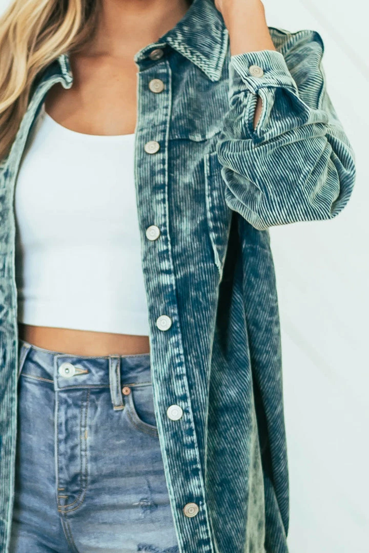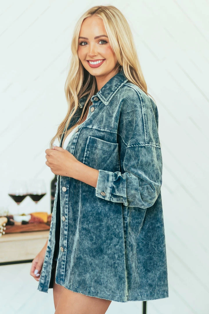 - Sea Blue Washed Collared Button Up Corduroy Jacket