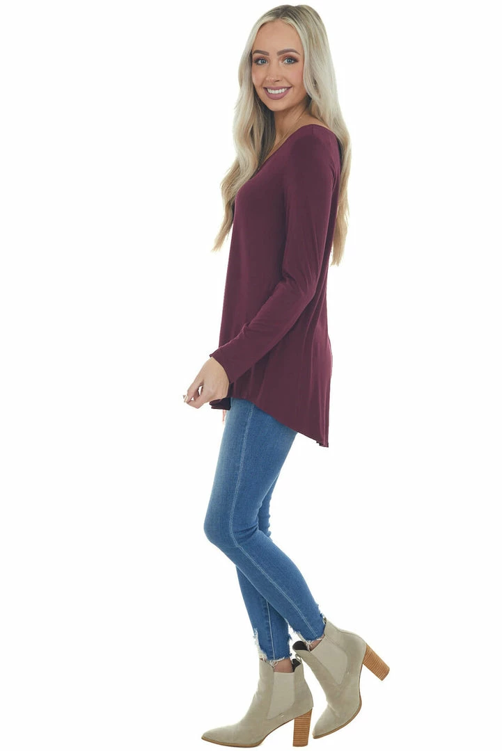 - Wine Rounded Hem V Neck Soft Knit Top